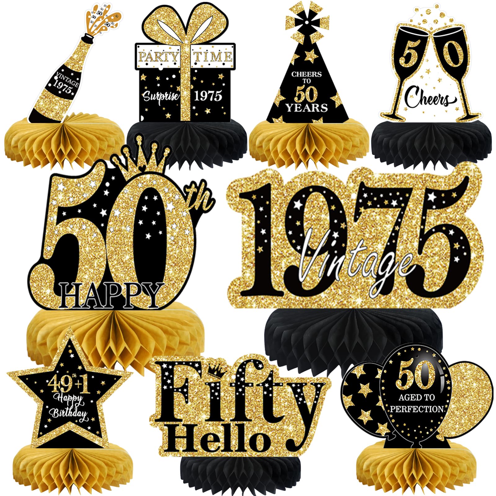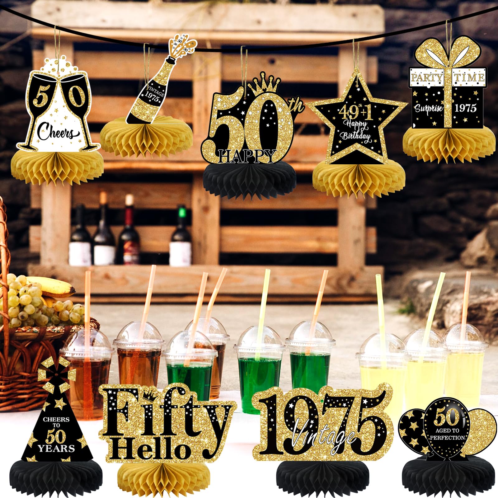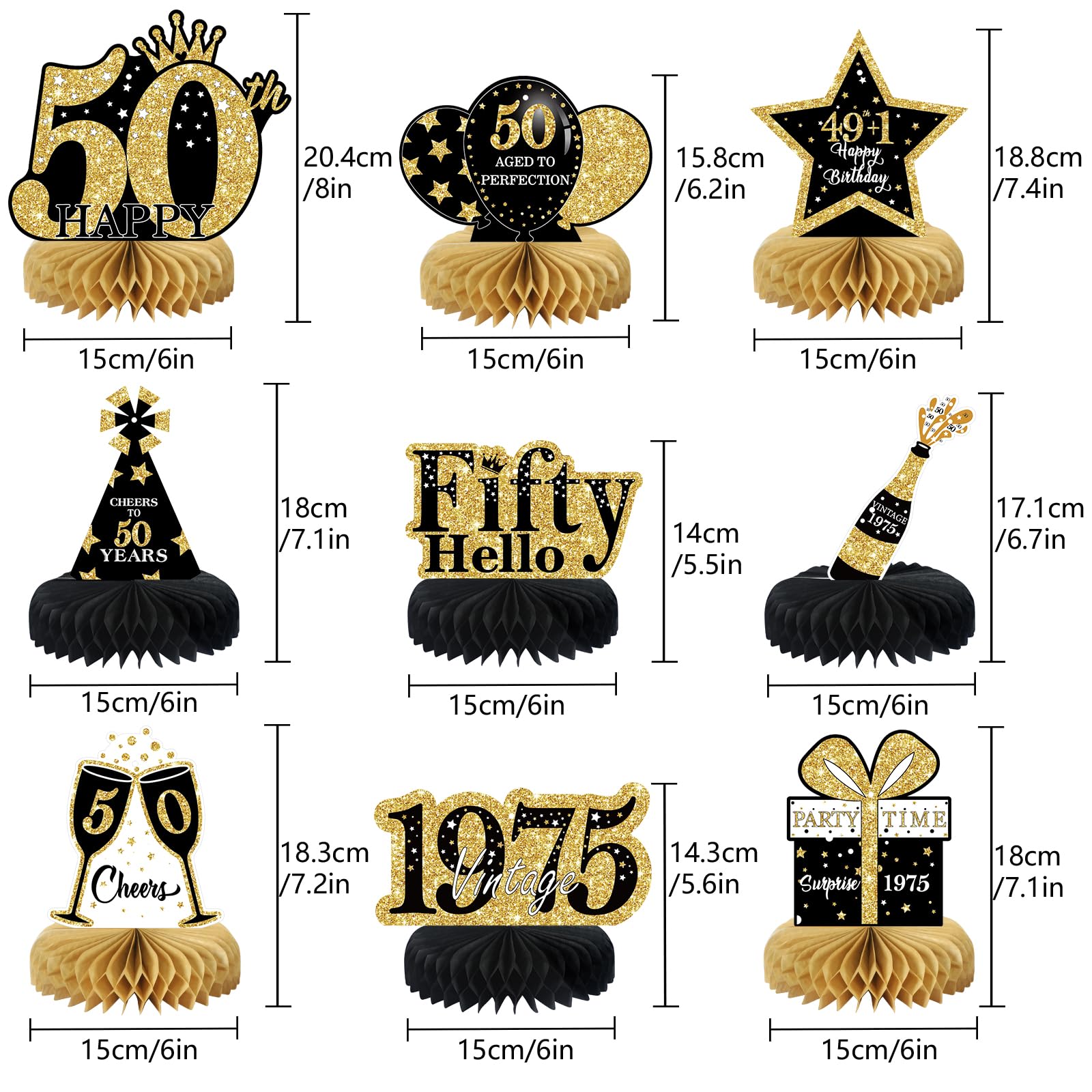 [You will get] - 9 pcs black gold 50th birthday decorations honeycomb table centerpieces for women men, it contains 9 patterned cardboards and 9 paper honeycombs (4 black and 5 gold),and matching lanyards. These chic 50th birthday table decorations are enough to decorate your themed party.