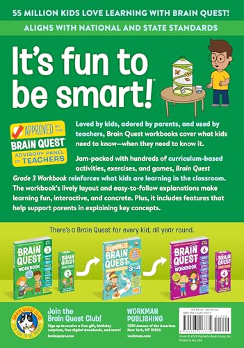 From hundreds of curriculum-based activities, exercises, and games in every subject to a new technology section, progress map, and stickers, discover the ultimate third grade workbook from America's #1 educational bestseller. Loved by kids, teacher approved, and trusted by parents, Brain Quest Grade 3 Workbook reviews and reinforces what children are learning in the classroom in an instantly engaging, entertaining way. Each page is jam packed with fun activities, practice exercises, and games covering spelling and vocabulary, reading comprehension grammar, multiplication and division, science, social studies, and much more. Whatβs New? Technology section Introduces children to computer science, coding, and logic Updated content Activities and illustrations are revised to reflect the diversity of children, their families, and experiences Support for parents and children Section openers preview upcoming content and provide directions and suggestions to help make learning stick A fun progress sticker mapwith stickers Helps children celebrate their accomplishments as they complete each section of the workbook Comes with A completion certificate Mini Smart Card question-and-answer deck Aligned with national and state standards and reviewed by award-winning teachers, this workbook appeals to childrenβs natural curiosity, with interactive layouts and easy-to-follow explanations that take the intimidation out of learning. Plus, itβs written to help support parents with explanations of key concepts for homework help!
