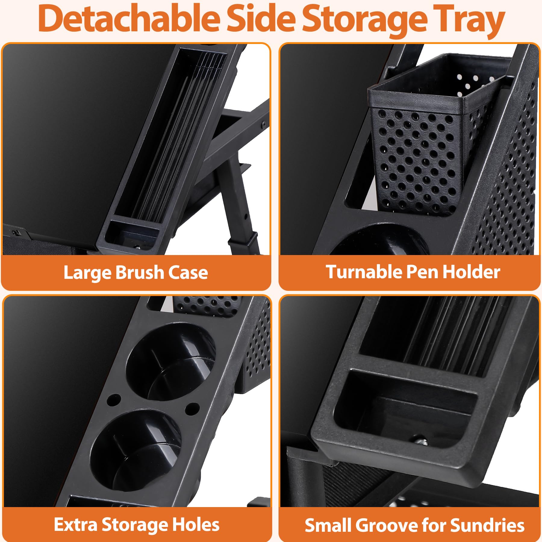 Large Storage Space: The painting table have 2 slide-out drawers and a storage shelf under the main table to store papers, drafting tools and other stuff. There is a pencil box on the right hand side. When the desktop is tilted, the Pencil Ledge on the table can ensure the pencil and drawing paper do not fall