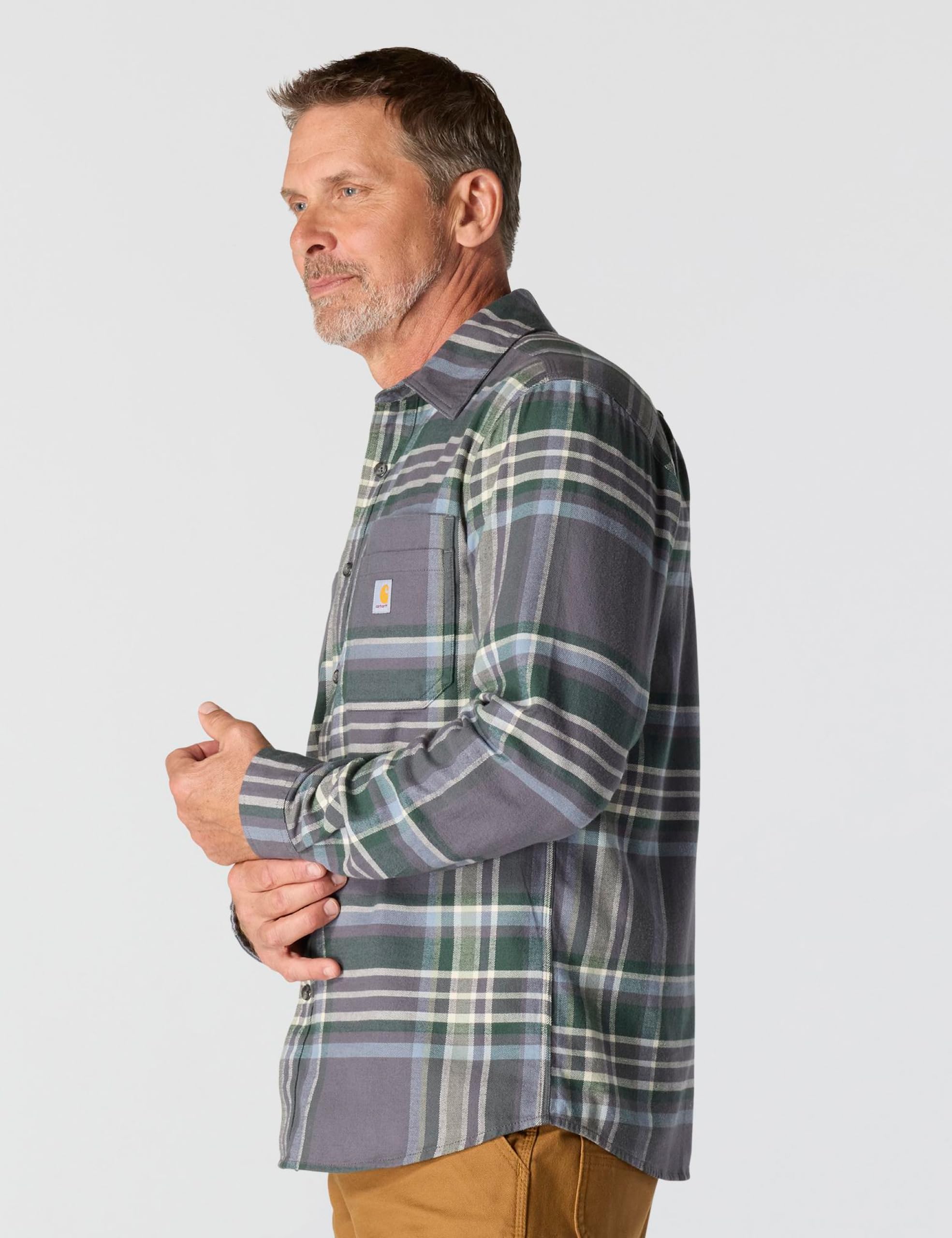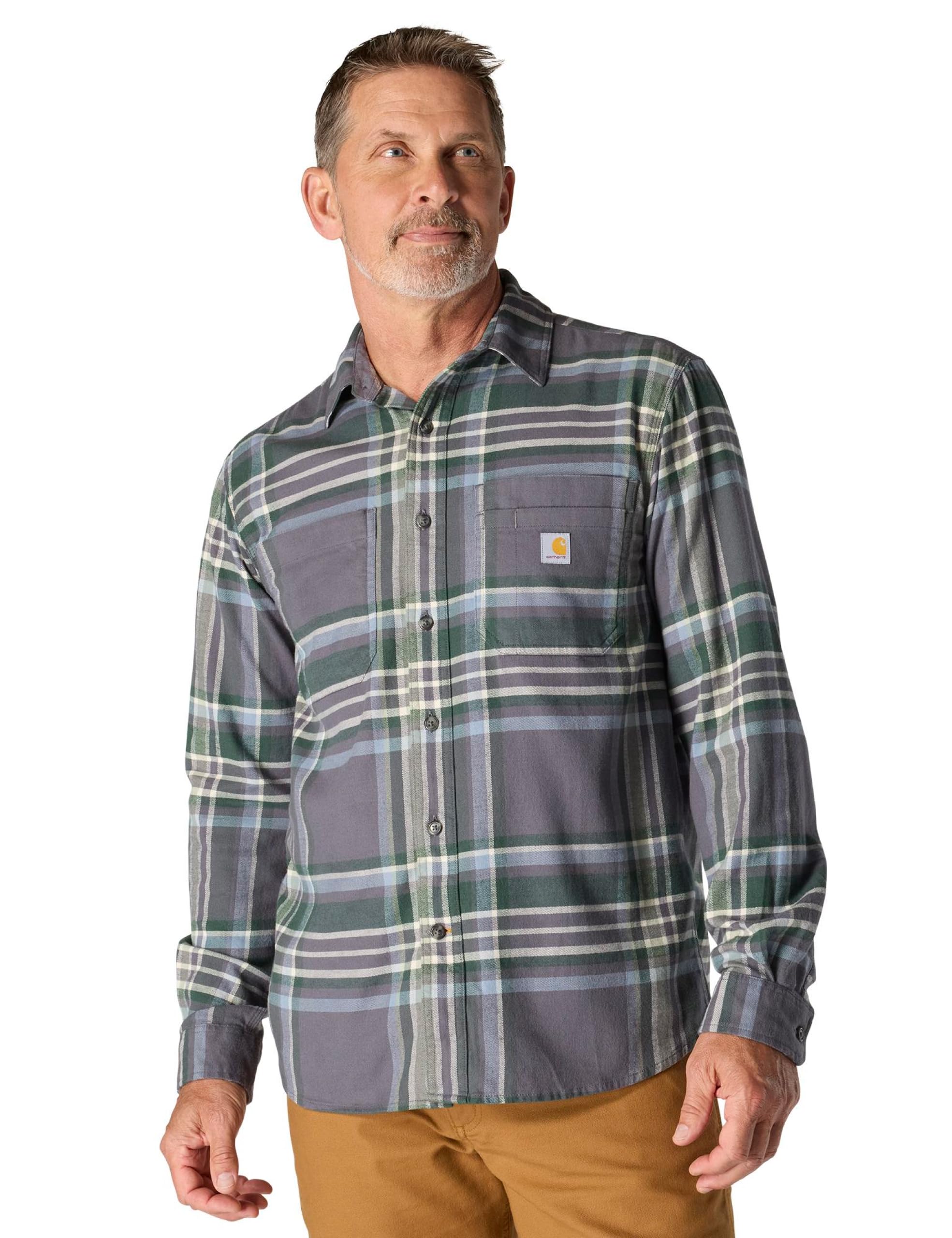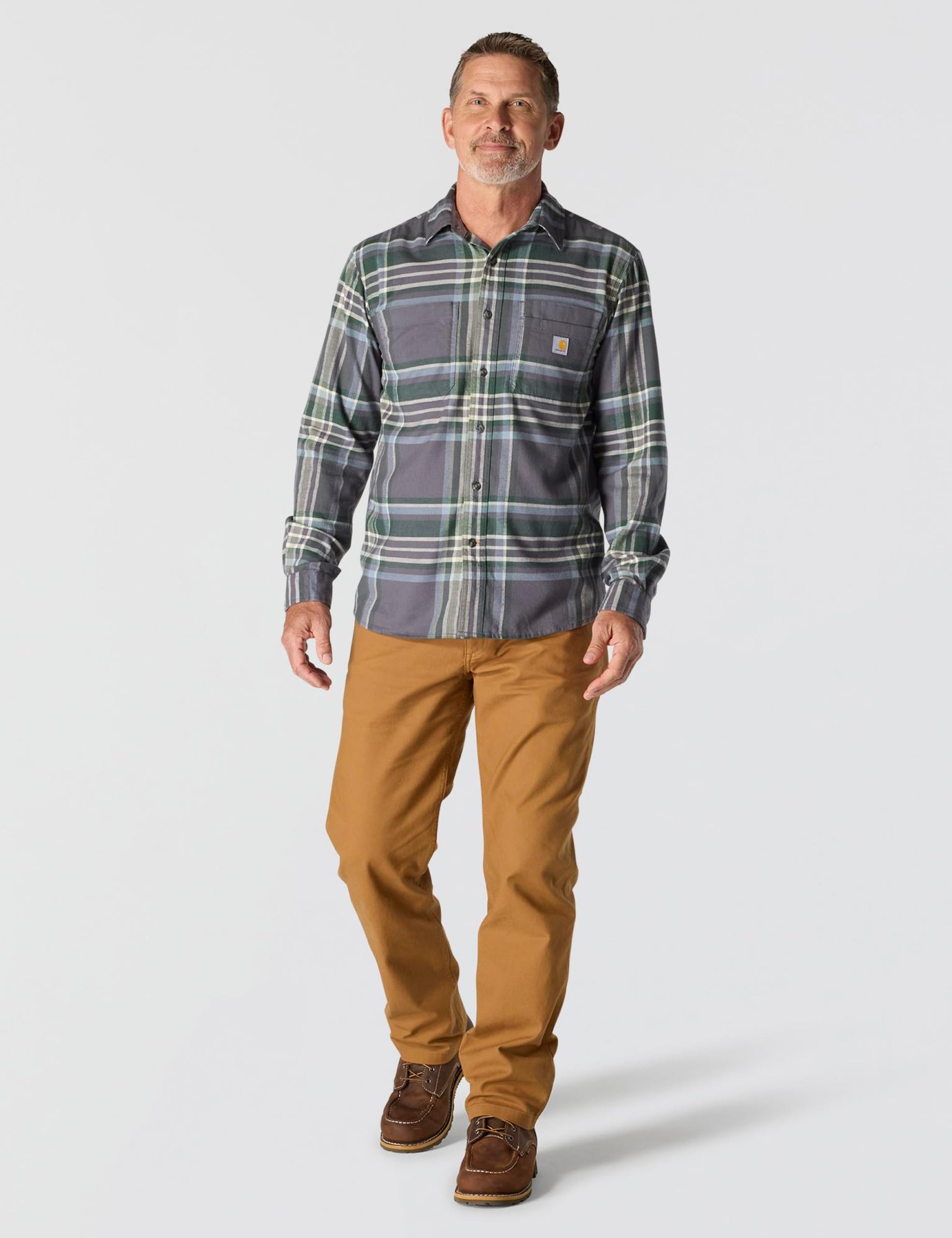 Description Made to be worn tucked or untucked, this men's Carhartt flannel shirt features a midweight cotton blend with just the right amount of stretch for an unrestricted range of motion. A loose fit allows for easy layering and a natural range of motion.