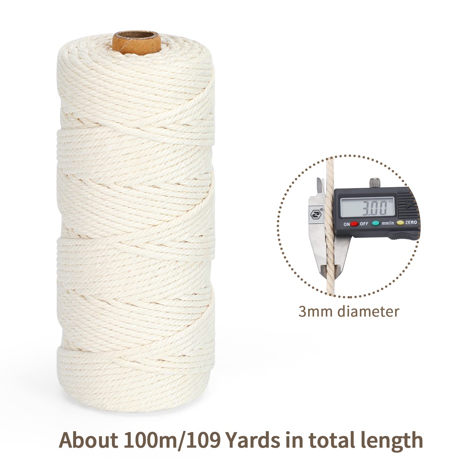 Size & Package: Macrame cotton string is 3mm (3/25") in diameter, the length is around 109yards for each spool. Our twisted cotton string is cut to length and packaged in spools, opp bag covered, keep it in stable and beautiful shape when shipped, easy to organize, prevent to mess when unraveled to use.