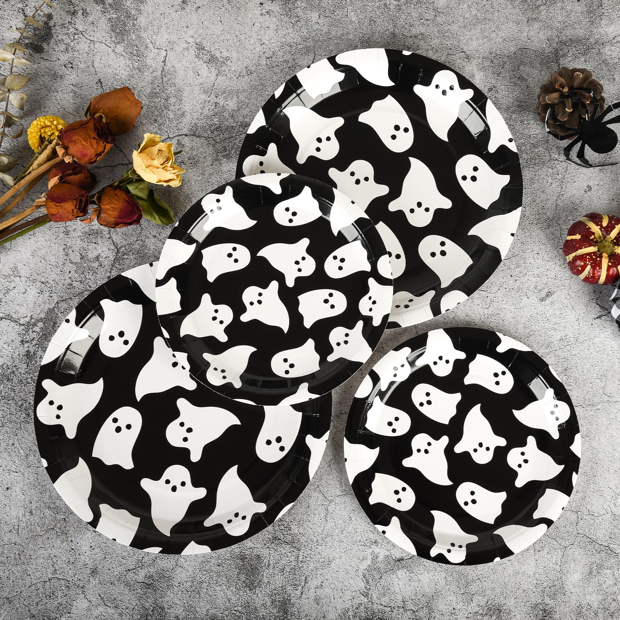 48 Pieces Halloween paper plates, black white ghost plates Halloween party tableware party supplies for Halloween party decorations๏ผ These Halloween party dinner plates are suitable for various occasions such as Halloween, fall, Thanksgiving, trick or treat, birthday parties, and more๏ผ Impress your guests with these adorable paper plates featuring black and white ghost expressions. Specifications: Materials: paper Size: about 9 inches and 7 inches in diameter Color: black white Package includes: 24 x large plates 24 x small plates Notes: Manual measurement, these may vary in sizes slightly. The color may exist a slight difference due to different screen displays.
