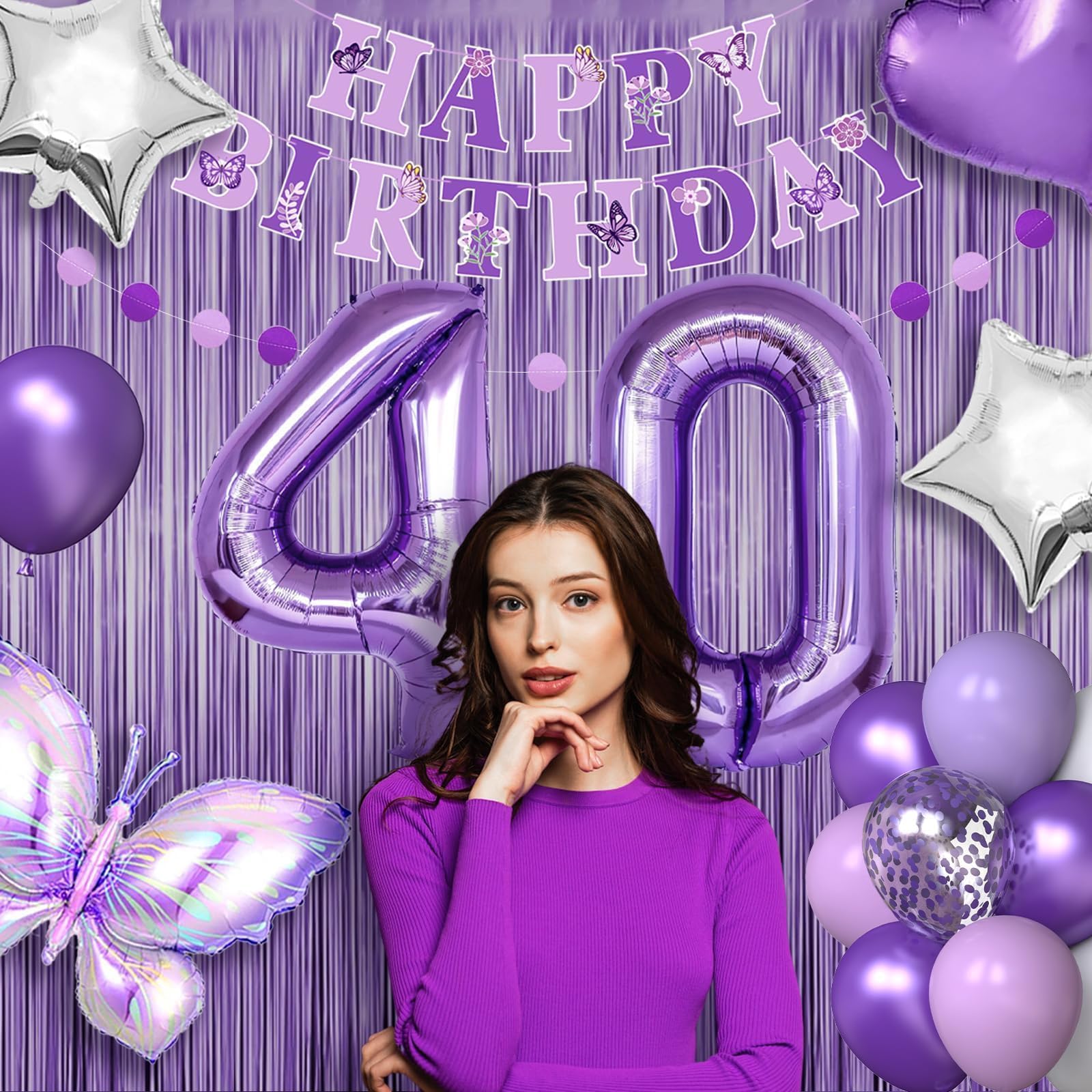 Happy Purple Birthday Party Supplies Set: Includes 32in foil number balloons*2, 39*79in purple metallic tinsel fringe curtains*2, 3D butterfly stickers*12 (3 different sizes-each size 4pcs), 39*29in butterfly foil balloon*1, butterfly ‘happy birthday’ banner*1, 12in purple confetti balloons*8, 10in balloons (metallic purple*10, maca pink*10, maca purple*10, white*10), 18in foil balloons (purple heart*1, silver star*2), purple pink circle dots garland*1, silver hanging swirls*6, cake topper*1