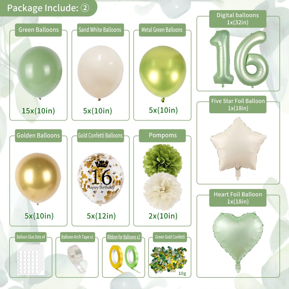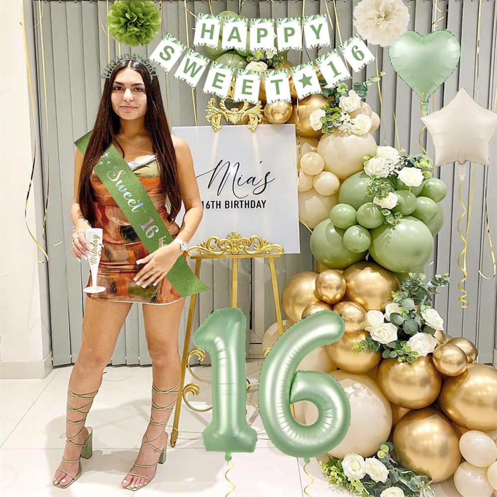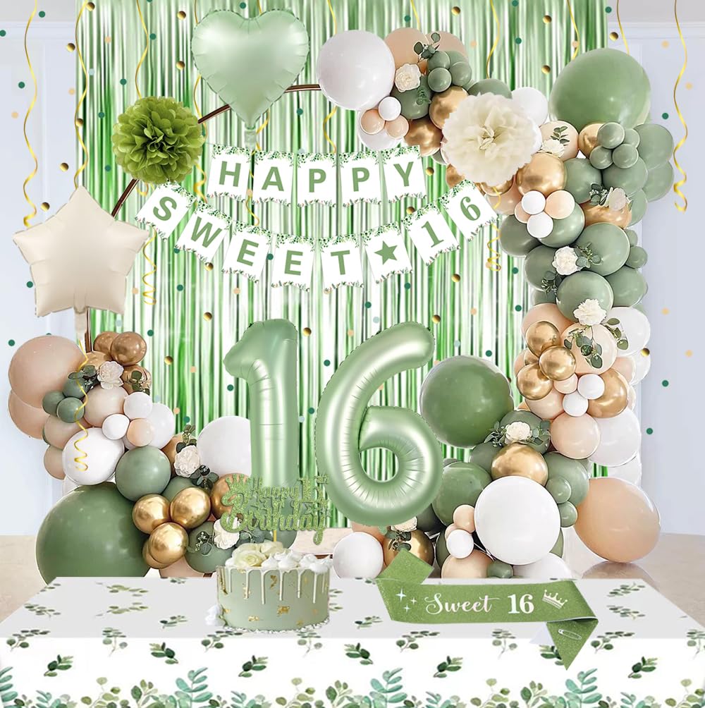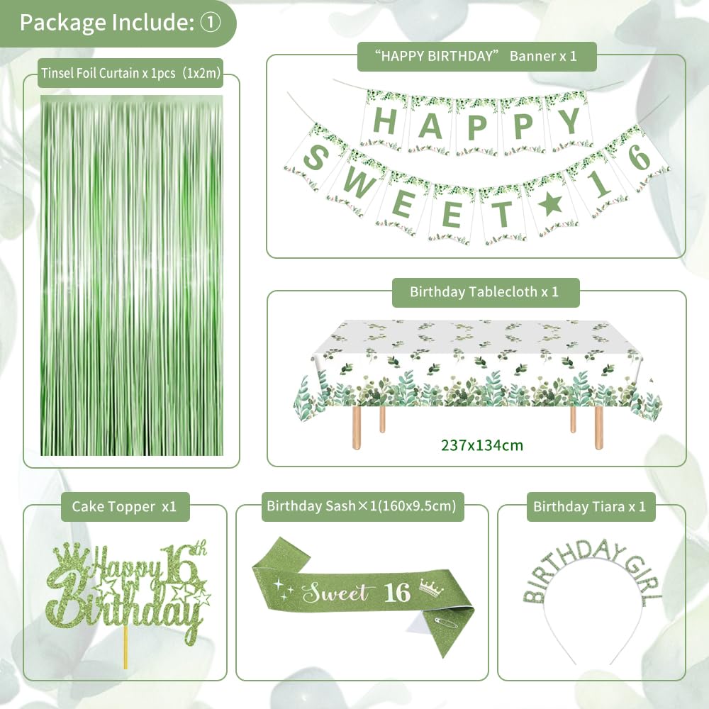 【Sweet 16 Party Decorations Set】This Sage Green Happy Birthday Decorations includes 1* piece Happy Birthday Banner, 1* green birthday crown, 1* green birthday sash 160 x 9.5cm, 1* green white tablecloth 237 x 134cm, 1* green rain curtain 1 x 2m, 1* 1+6 numeral balloons 32", 15* sage green balloons, 5* sand white balloons, 5* gold metallic balloons, 5* green metallic balloons,5* gold confetti balloons, 2 x foil balloons, 2 x paper pompoms flowers, 1* Happy Birthday cake topper, 10g green gold confetti, 2* 10m band, 1* 16 foot balloon chain, 4 piece glue.
