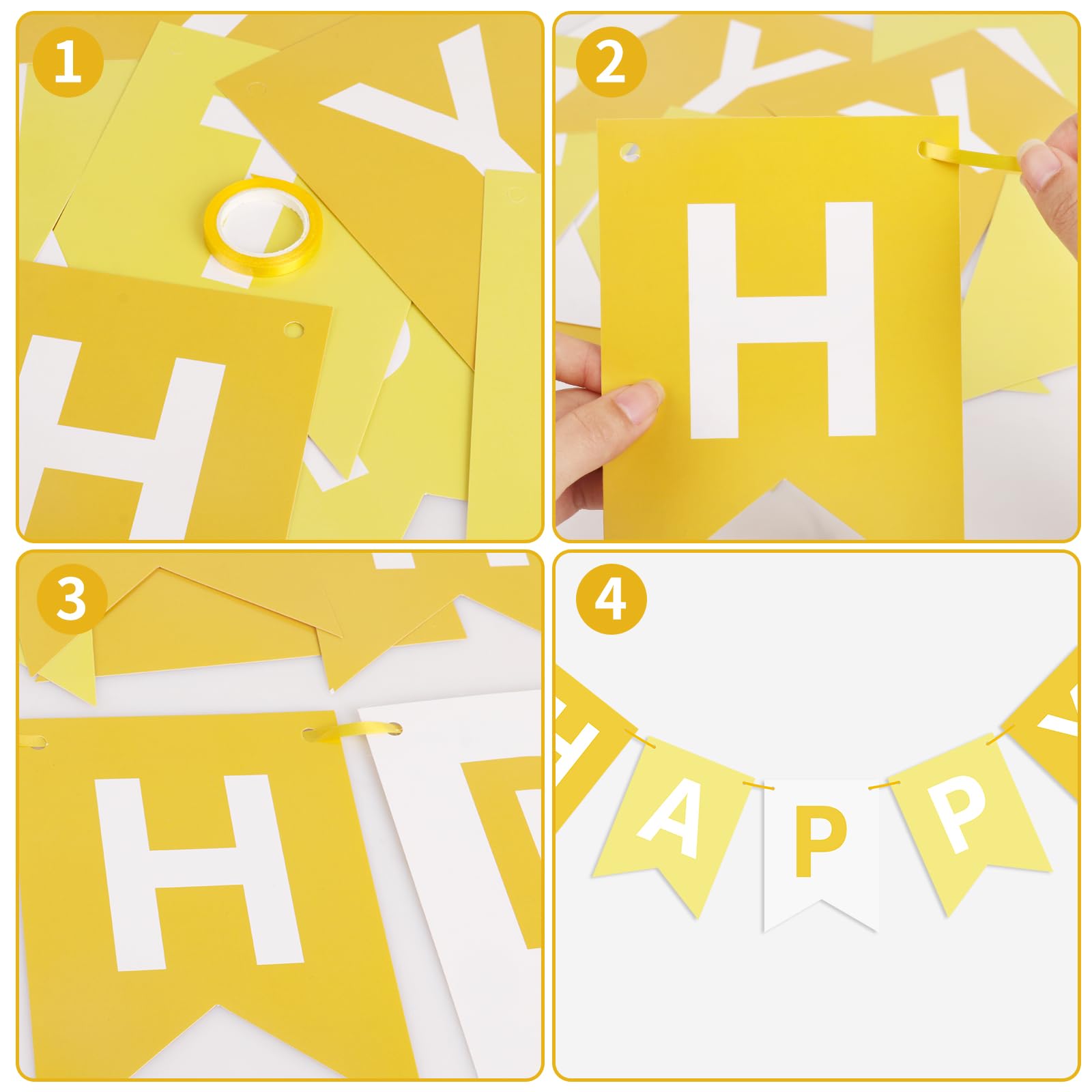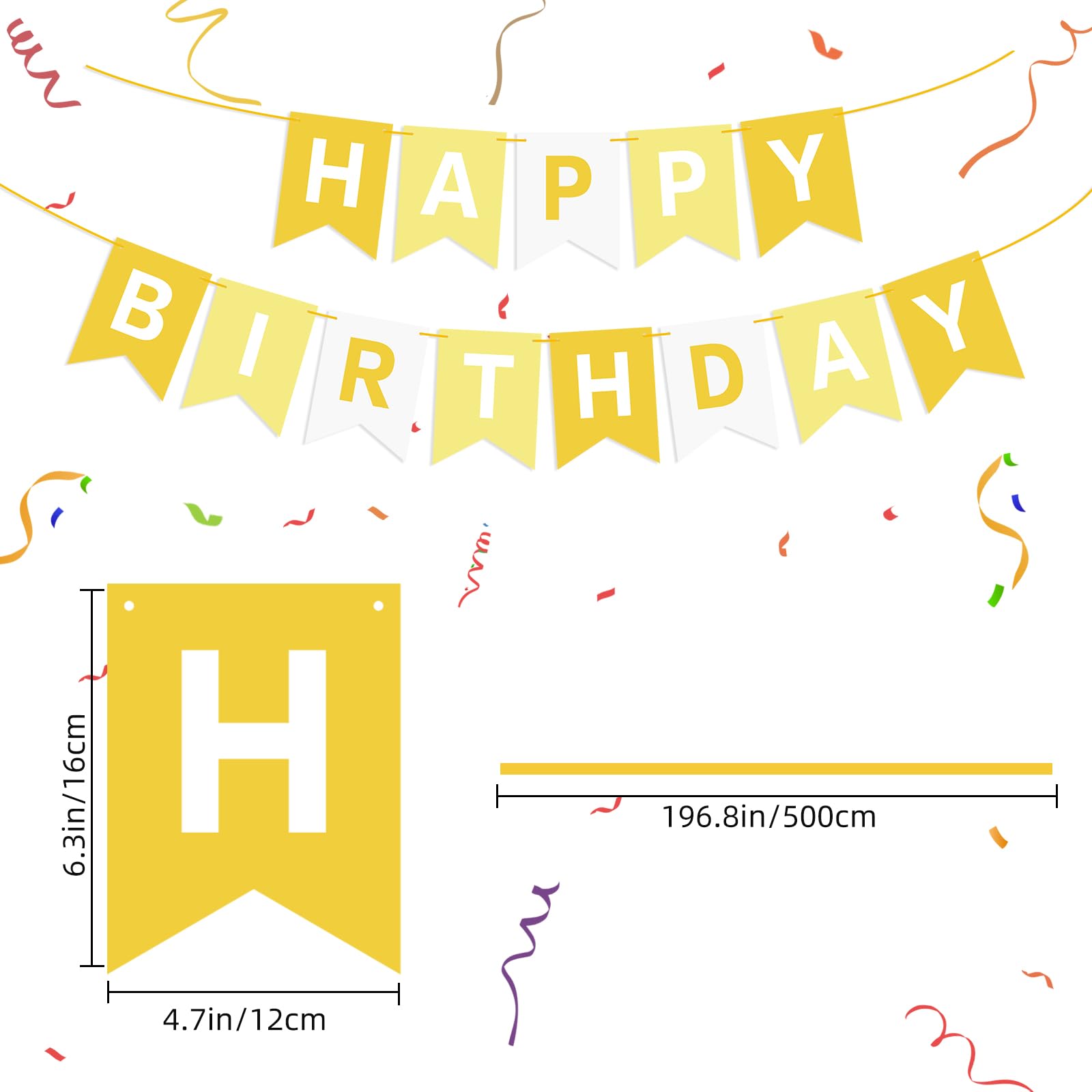 EASY-TO-MAKE: Each yellow banner flag card size is 4.5" × 6.3". 13 paper flags that spell the phrase "HAPPY BIRTHDAY" on 1 roll strand (length 16.4ft). You can use a plastic needle with the ribbon to easily string all the letters together without effort, the spacing between the flags is adjustable. You can move the triangle flags to have a different look.