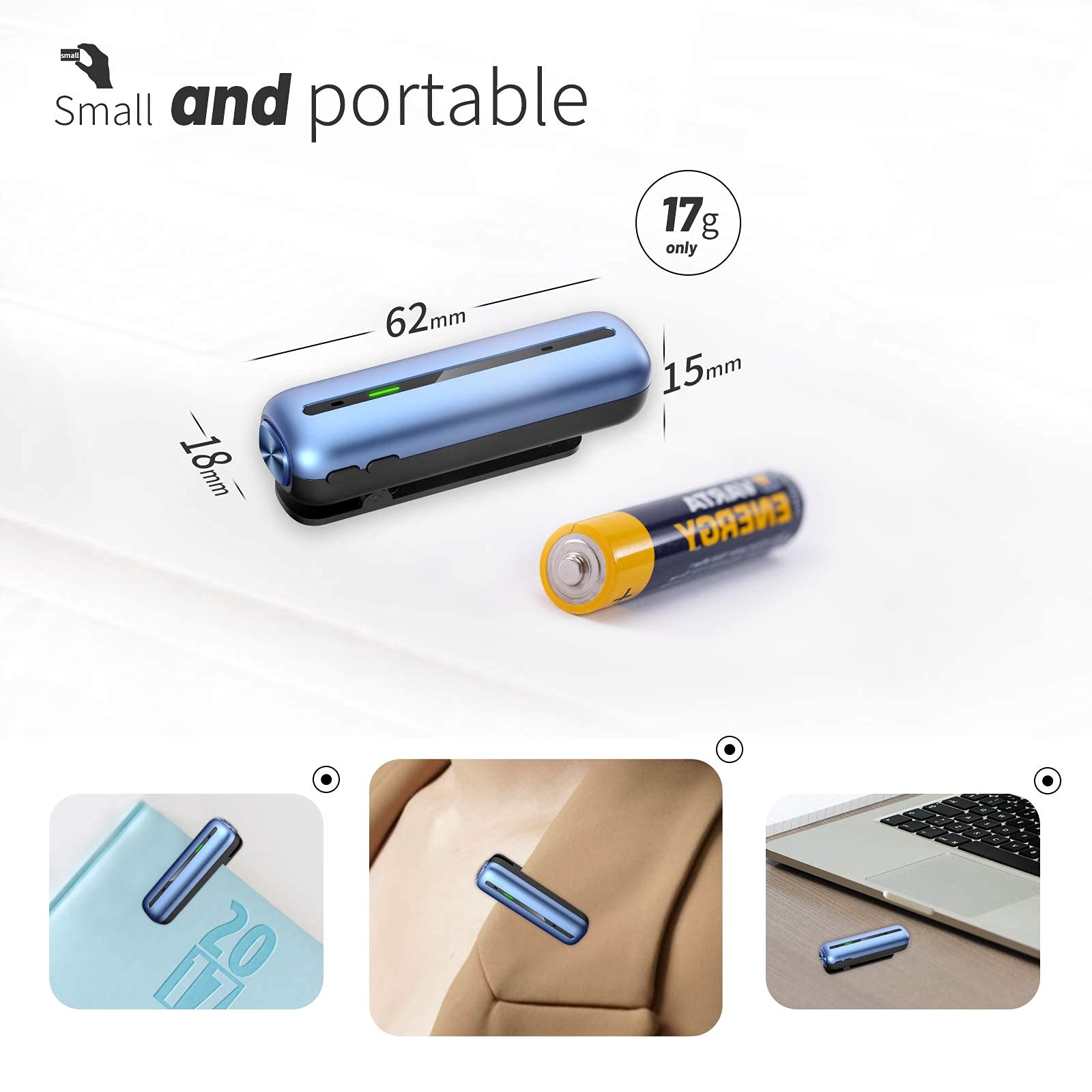 【Ultra-Small With Back Clip Design】 At a diminutive 6.2x1.8x1.5cm, S01 weighs only 17 grams with a sleek and stylish design and solid metal case. With clip on the back, you can attach it onto a notebook, your collar, front pocket, or straps etc. A 30-min full charge is sufficient for 10 hours continuous long duration voice recording or 30 days standby.