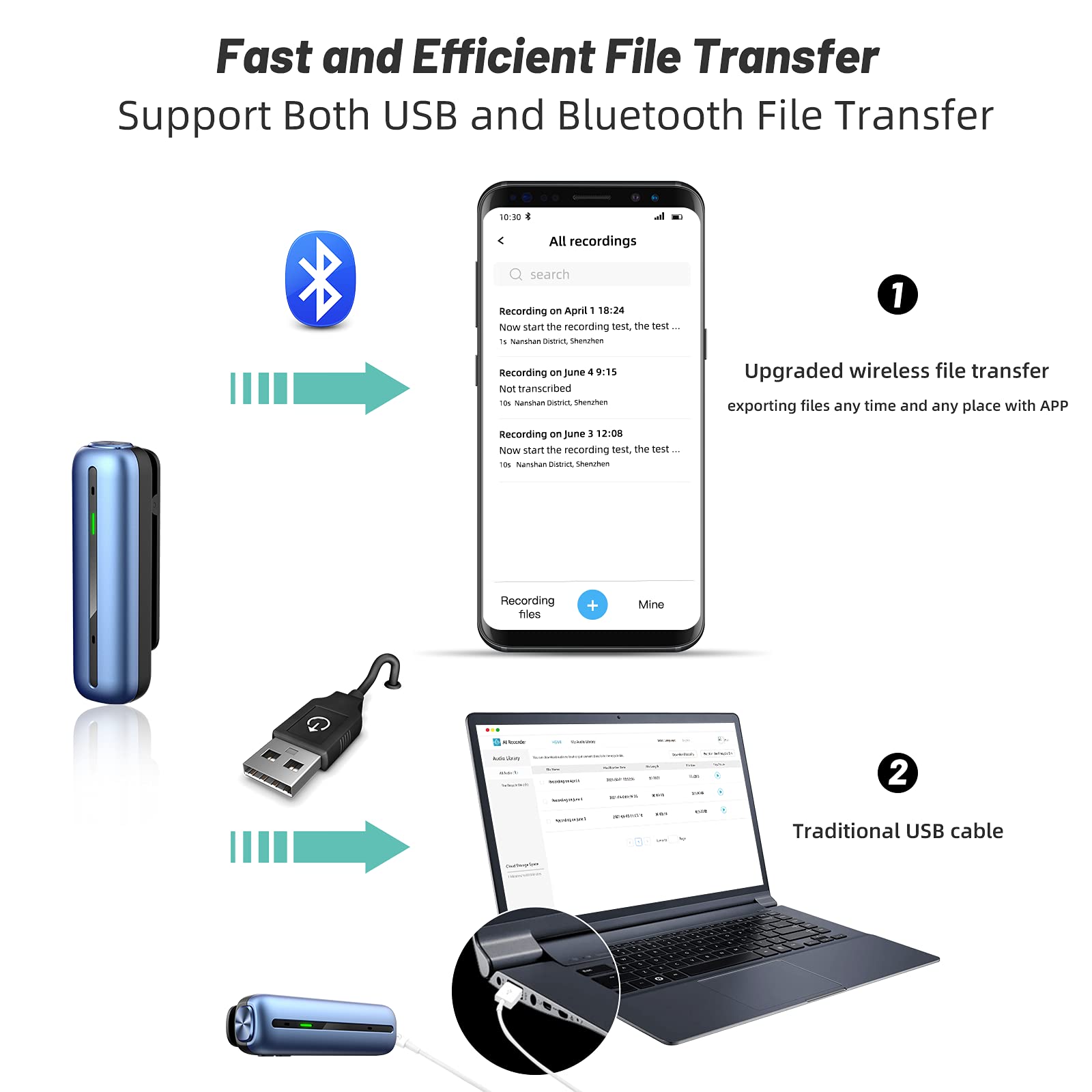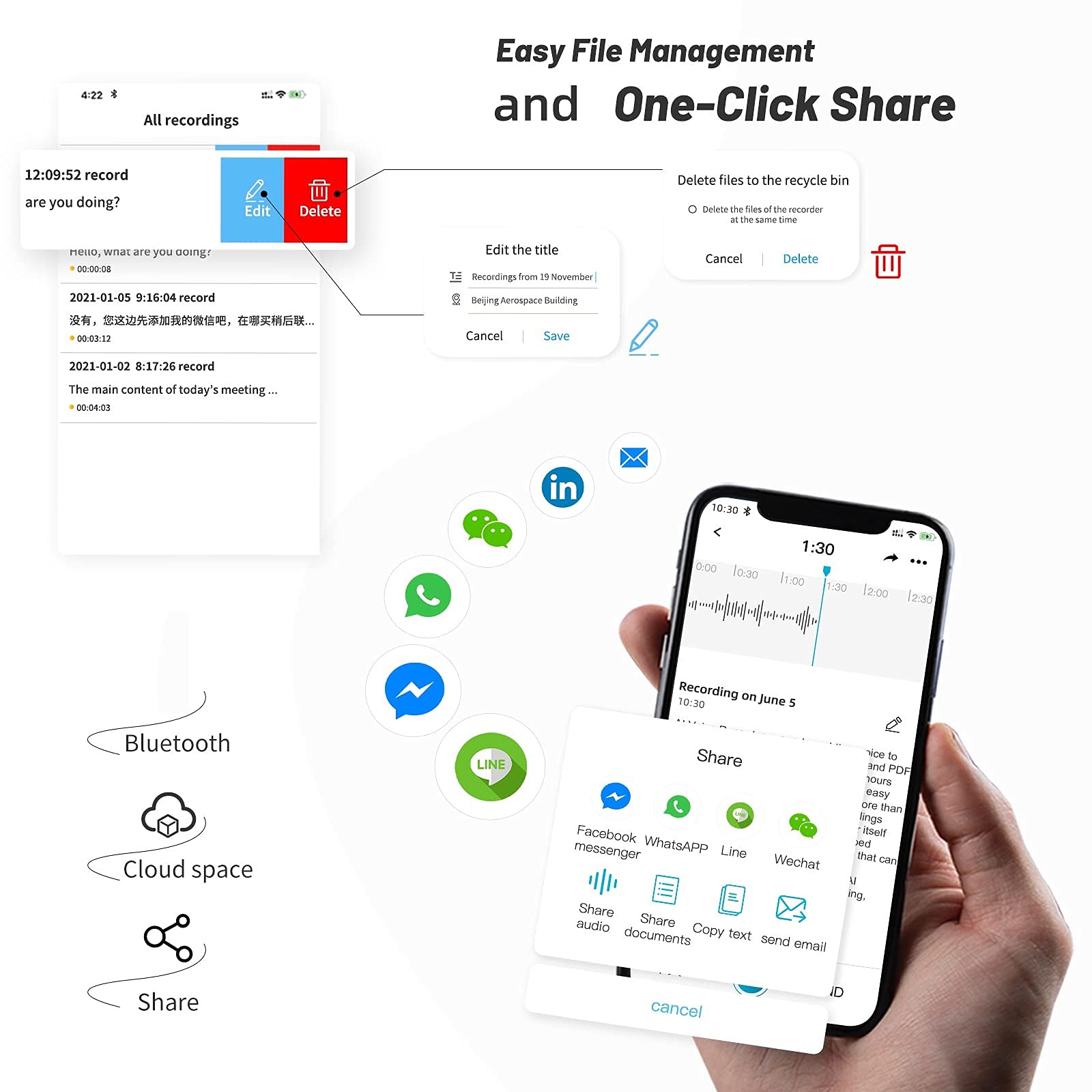 【Easy File Management and One-Click Share】The audio files can be synchronized and saved in your mobile phone via Bluetooth. More importantly, it can be edited and organized easily for future management and searching. The recording files can be automatically stored in your own cloud space, or be downloaded in PCs or smart phones. The transcribed contents in MP3 / Word / TXT format can be sent to colleagues or friends or shared by just one click on social media such as Facebook and Twitter.