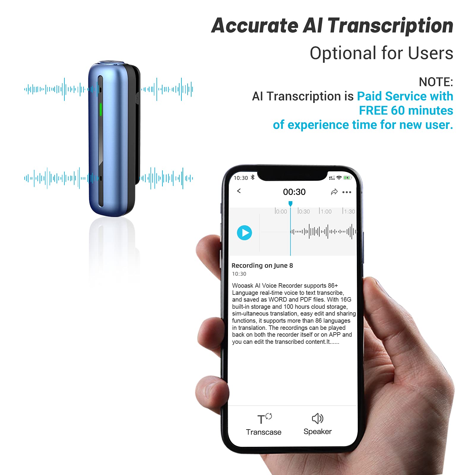 【Simultaneous Translation (Optional)】 S01 is the World's First 86 Languages AI Voice Transcription Recorder with up to 97% accuracy in 48 languages and 38 accents. It can perform real time transcribe & translate, edit & share to all participants. We offer the first 60-min for free for speech-to-tranlated-text service and the text will display on your smartphone real-time or you can hear via earplug directly. After 60 minutes, please follow the Mobile APP instruction and pay.