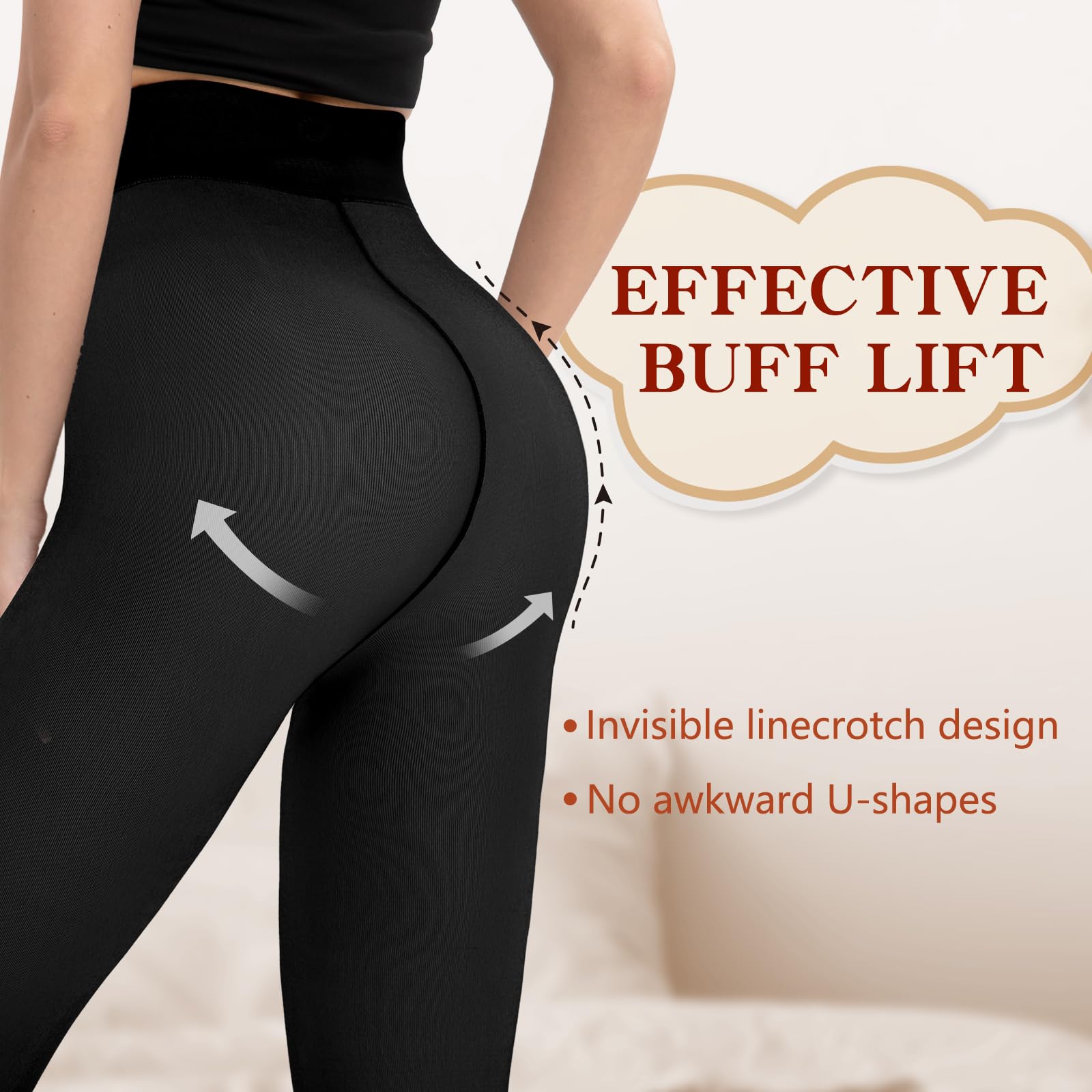 【Invisible Crotch Design】Our fleece lined tights feature an invisible single line crotch design, compared to other double lines crotch designs on the market, our fleece lined leggings highlights the lines of the buttocks and has a visual effect of lifting the hip and slimming the leg. The good elasticity of fleece tights can firmly tie the pants to your legs, preventing the crotch of the tight from slipping and falling off, not affecting your walking