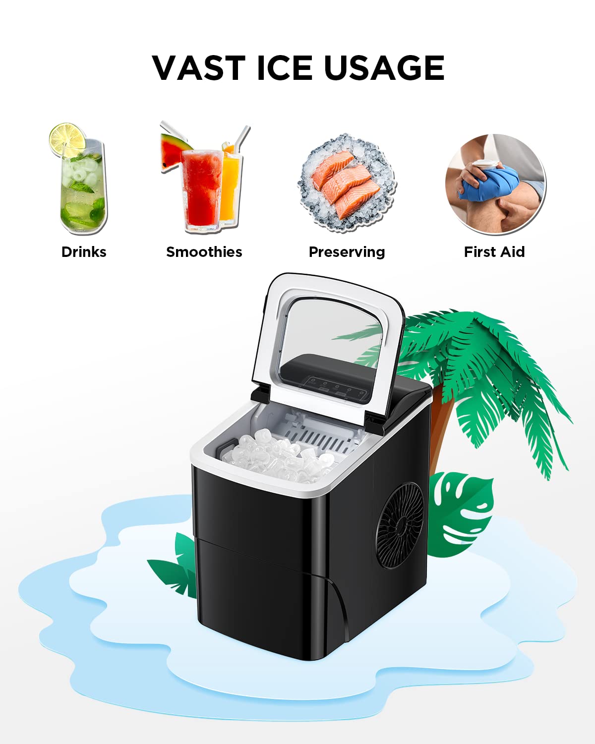 Quiet & Friendly Ice Machine: When making ice cubes, the noise is lower than 35dB, allowing you to relax and enjoy your time without the sound of the ice maker disturbing you. Not only do our ice machines consume very little energy, but the countertop ice machines have a recirculating water tank that does not cause any waste of water.
