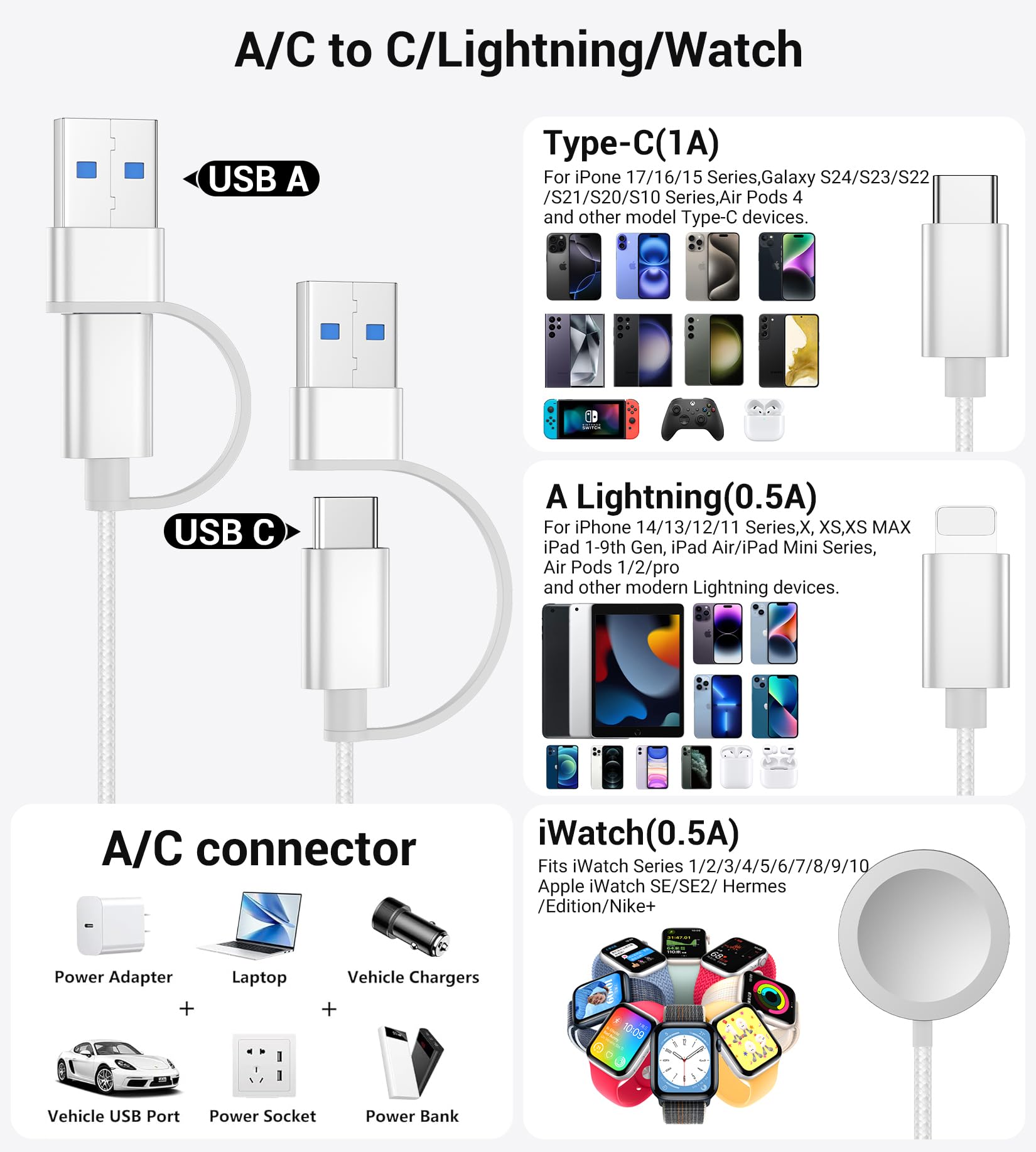 【3-in-2 Multi Charging Cable】3-in-2 multi charging cable provide 6 charging modes (USB-C/A for Apple Watch charger, Lightning, and Type-C),which compatible with iWatch Series 1-9, SE, and Ultra models, compatible with iPhone 17/16/15 and newer models,and iPads (Lightning/USB-C).A portable travel charger and a universal charging cable for multiple devices,designed to charge multiple devices at once