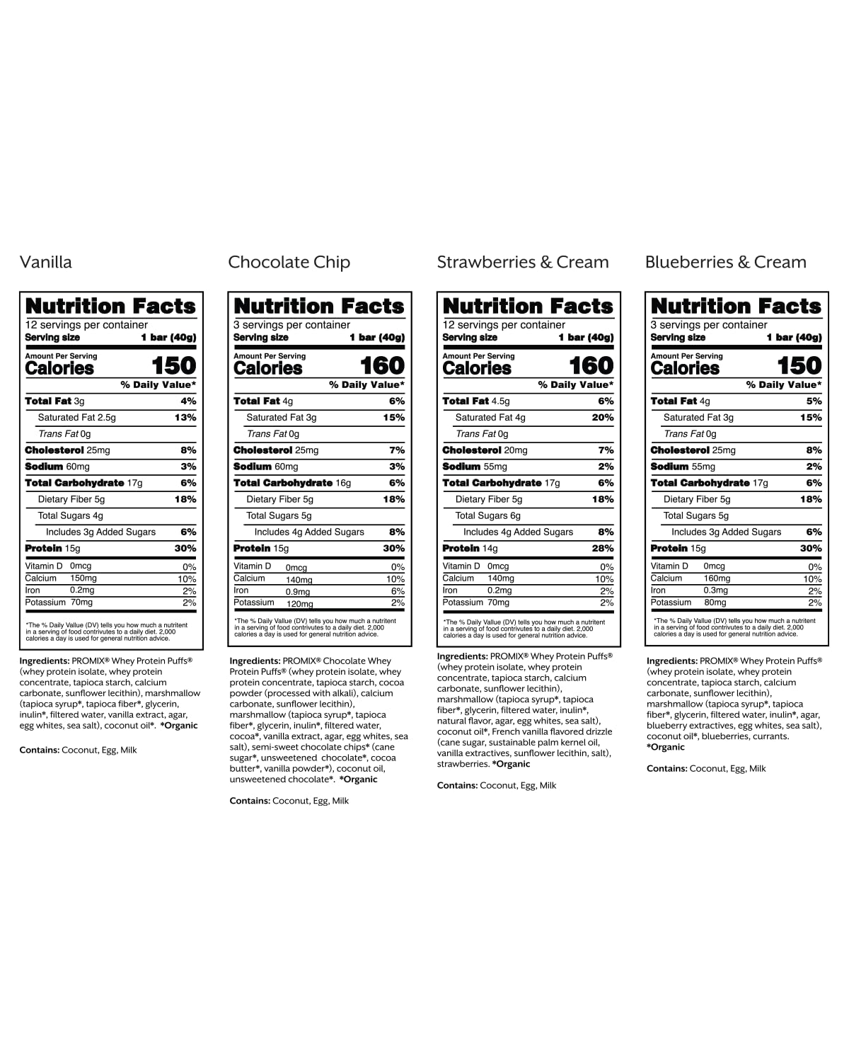 A High-Protein Treat: ProMix Protein Puff Bars combine our Whey Protein Puffs and marshmallow for a tasty, rice Krispy-like snack with 15g of protein and just 5g of sugar — 40% less than the leading protein bar. Vanilla, Chocolate, Strawberry, and Blueberry flavor. 12 bars per box.