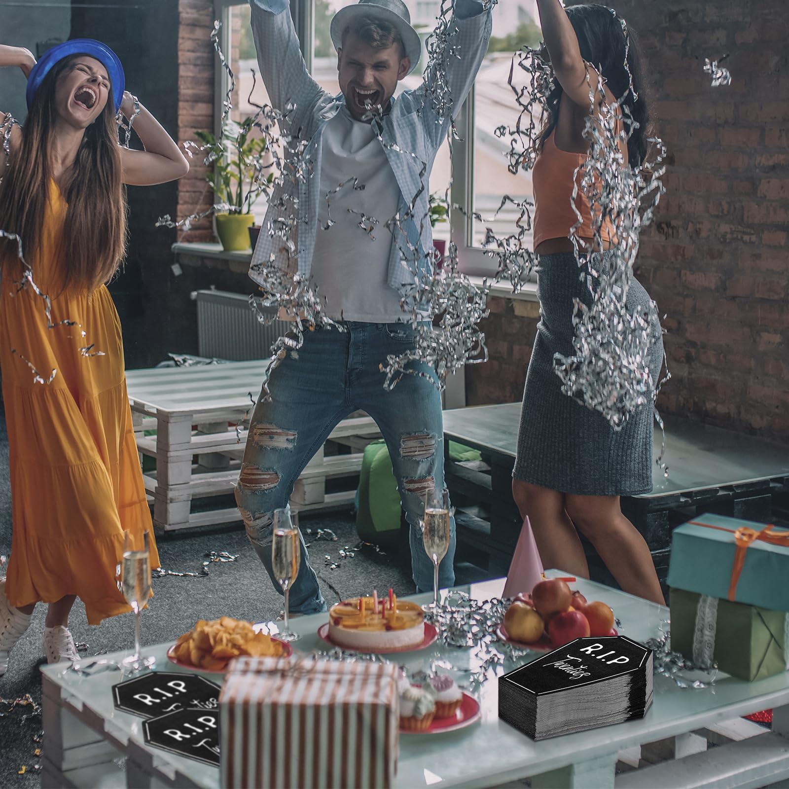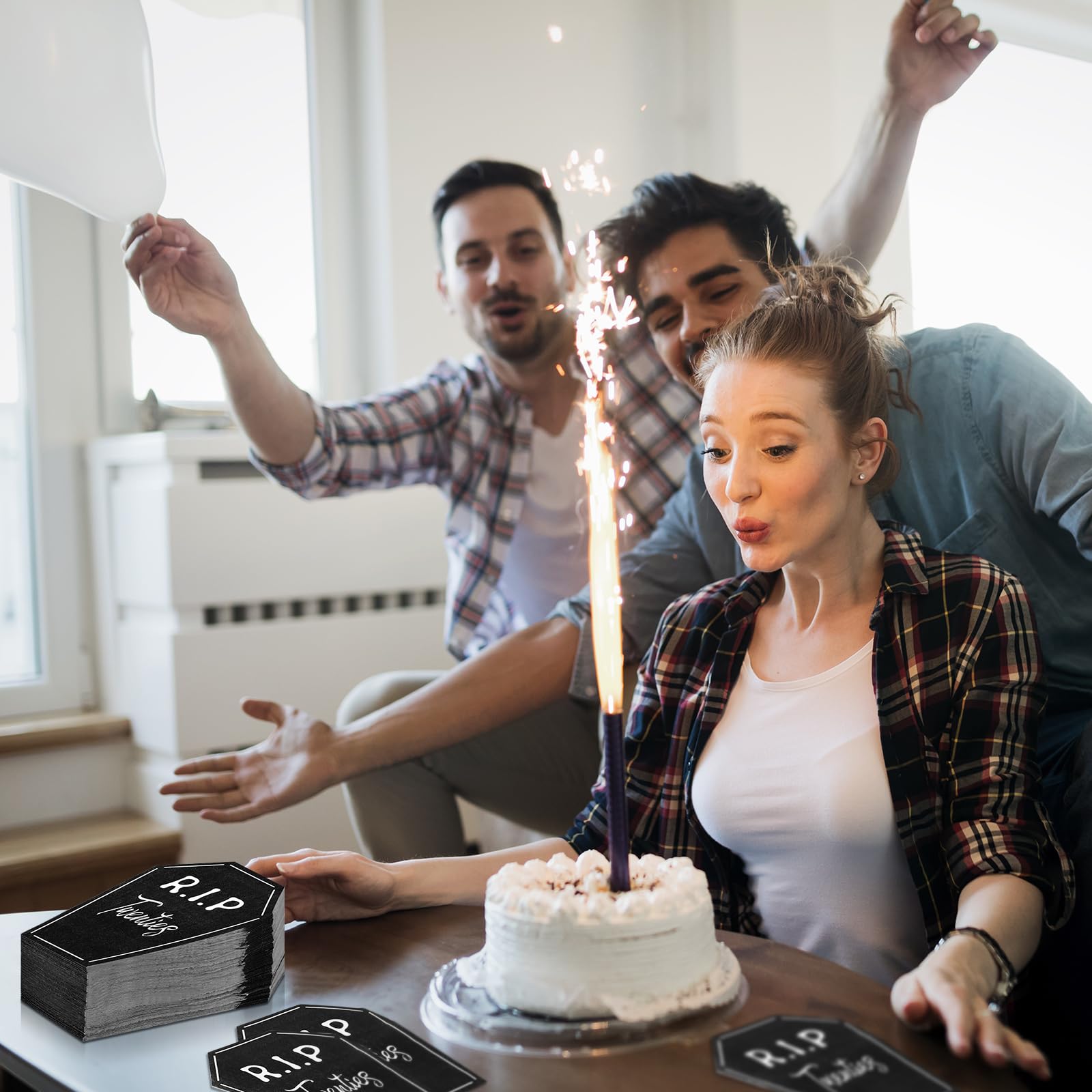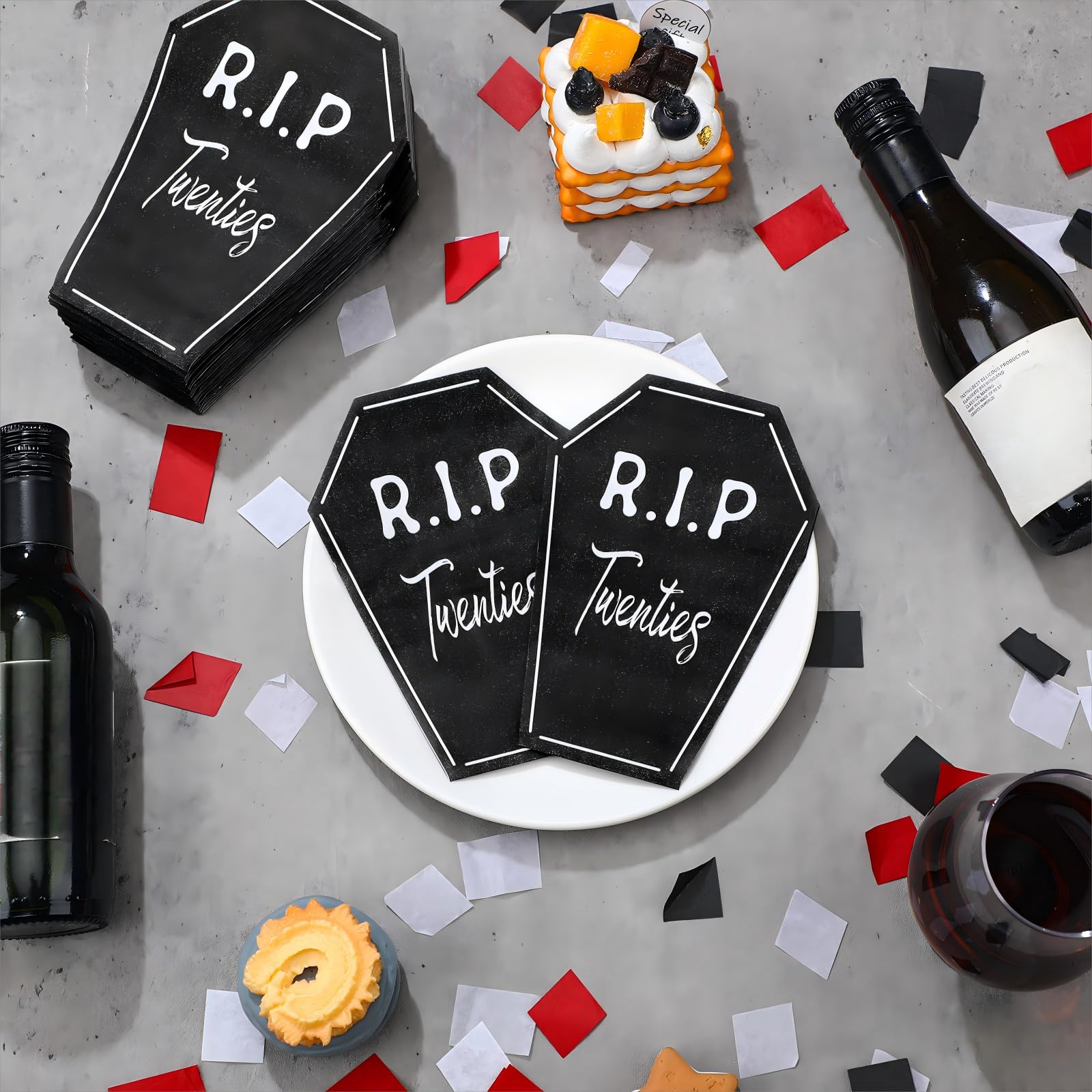 Dark Elegance: black and white cocktail napkins for rip to my 20s birthday decorations are eye catching and cool, enhancing the party ambiance; Printed with [R. I. P Twenties] and designed in tombstones shape, they not only keep the table clean, but also blend ideally with the other decorations
