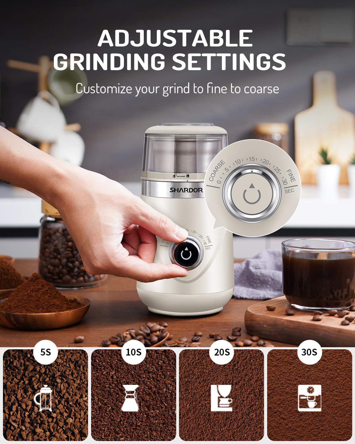 【Adjustable Grinding Precision】There are seconds marks above the timing knob, from coarse to fine. You can choose the precision of powder according to your needs.