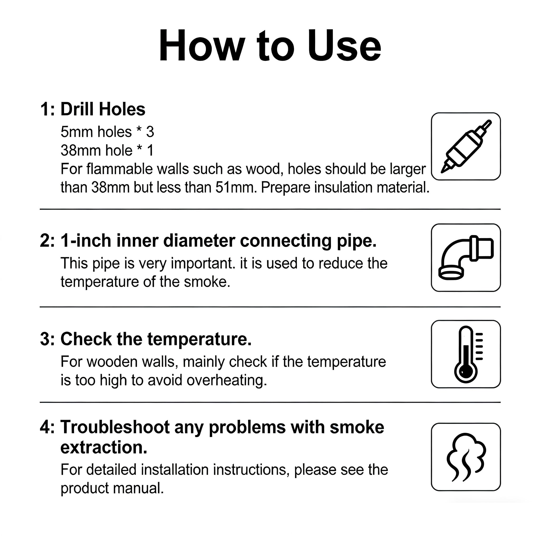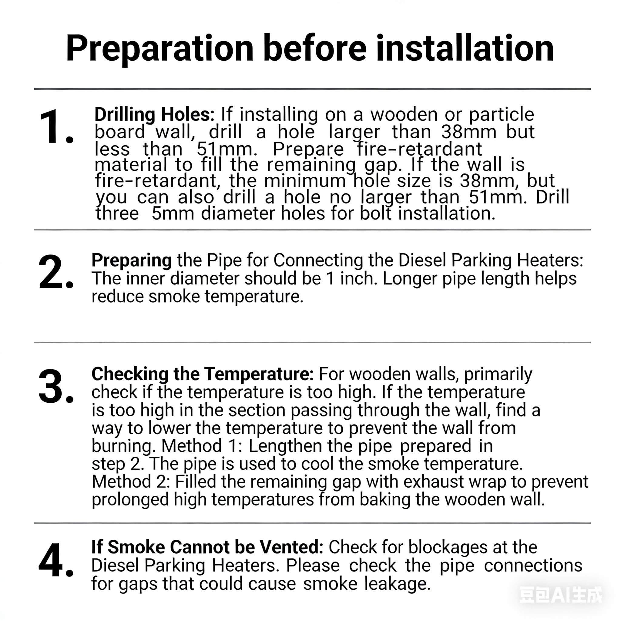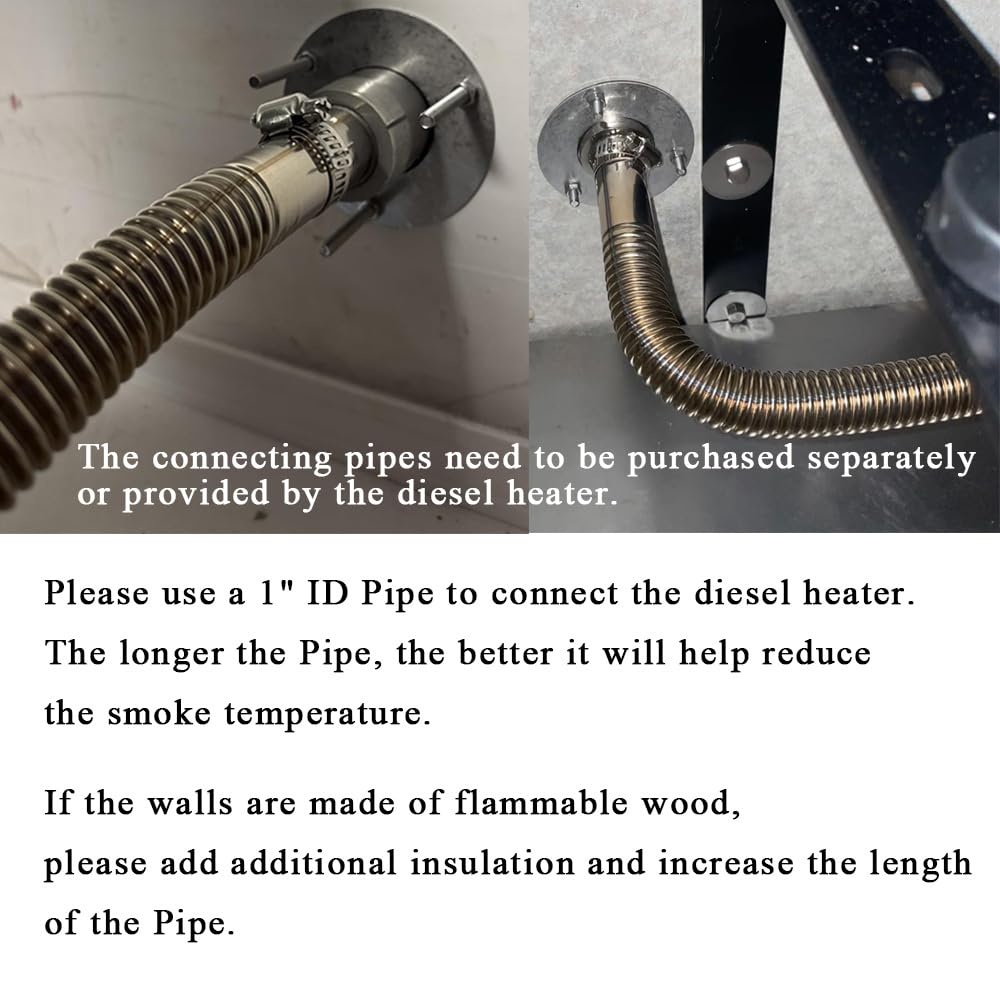 Fit for 24mm inner diameter hose pipe Fit for Webasto, Planar, Eberspacher, Chinese Diesel Parking heaters var4 Surface polishing,corrosion resistance and durability in the saltwater environment Made of Marine grade 316 stainless steel, Excellent seawater corrosion resistance and durable Easy installation With screws and Big Gasket Package Includes: 1 Pcs Thru Hull, Straight 3 Pcs screws 3 Pcs Big Gasket Preparation before installation: 1. Drilling Holes: If installing on a wooden or particle board wall, drill a hole larger than 38mm but less than 51mm. Prepare fire-retardant material to fill the remaining gap. If the wall is fire-retardant, the minimum hole size is 38mm, but you can also drill a hole no larger than 51mm. Drill three 5mm diameter holes for bolt installation. 2. Preparing the Pipe for Connecting the Diesel Parking Heaters. The inner diameter should be 1 inch. Longer pipe length helps reduce smoke temperature. 3. Checking the Temperature: For wooden walls, primarily check if the temperature is too high. If the temperature is too high in the section passing through the wall, find a way to lower the temperature to prevent the wall from burning. Method 1: Lengthen the pipe prepared in step 2. The pipe is used to cool the smoke temperature. Method 2: Filled the remaining gap with exhaust wrap to prevent prolonged high temperatures from baking the wooden wall. 4. If Smoke Cannot be Vented: Check for blockages at the Diesel Parking Heaters. Please check the pipe connections for gaps that could cause smoke leakage.