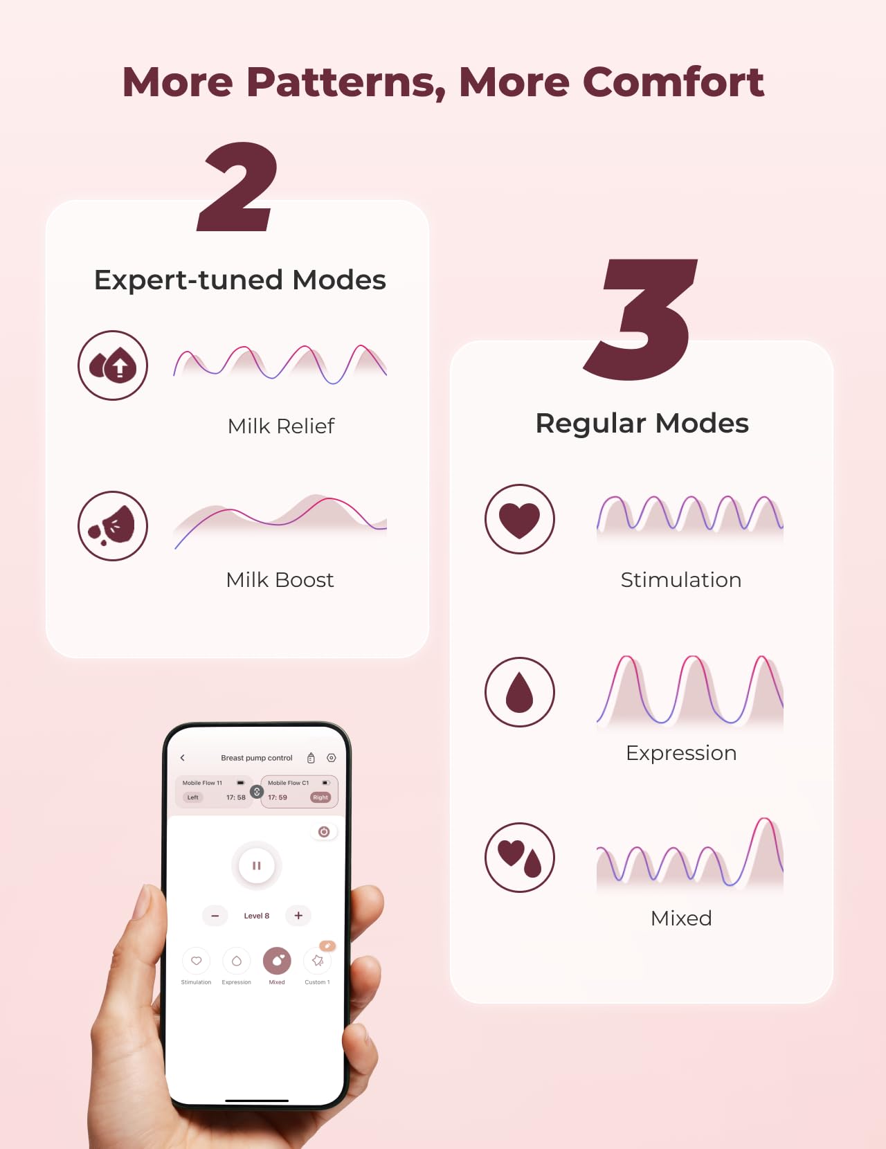 Multi-Modes: Select from 3 regular modes (Stimulation+ Expression+Mixed) on the pump motor. You can also experience the Personalized Modes and 2 Specialist Modes (Milk Relief+Milk Boost) from your phone. Craft your rhythm to suit your comfort and preference. You will always find your optimal mode!
