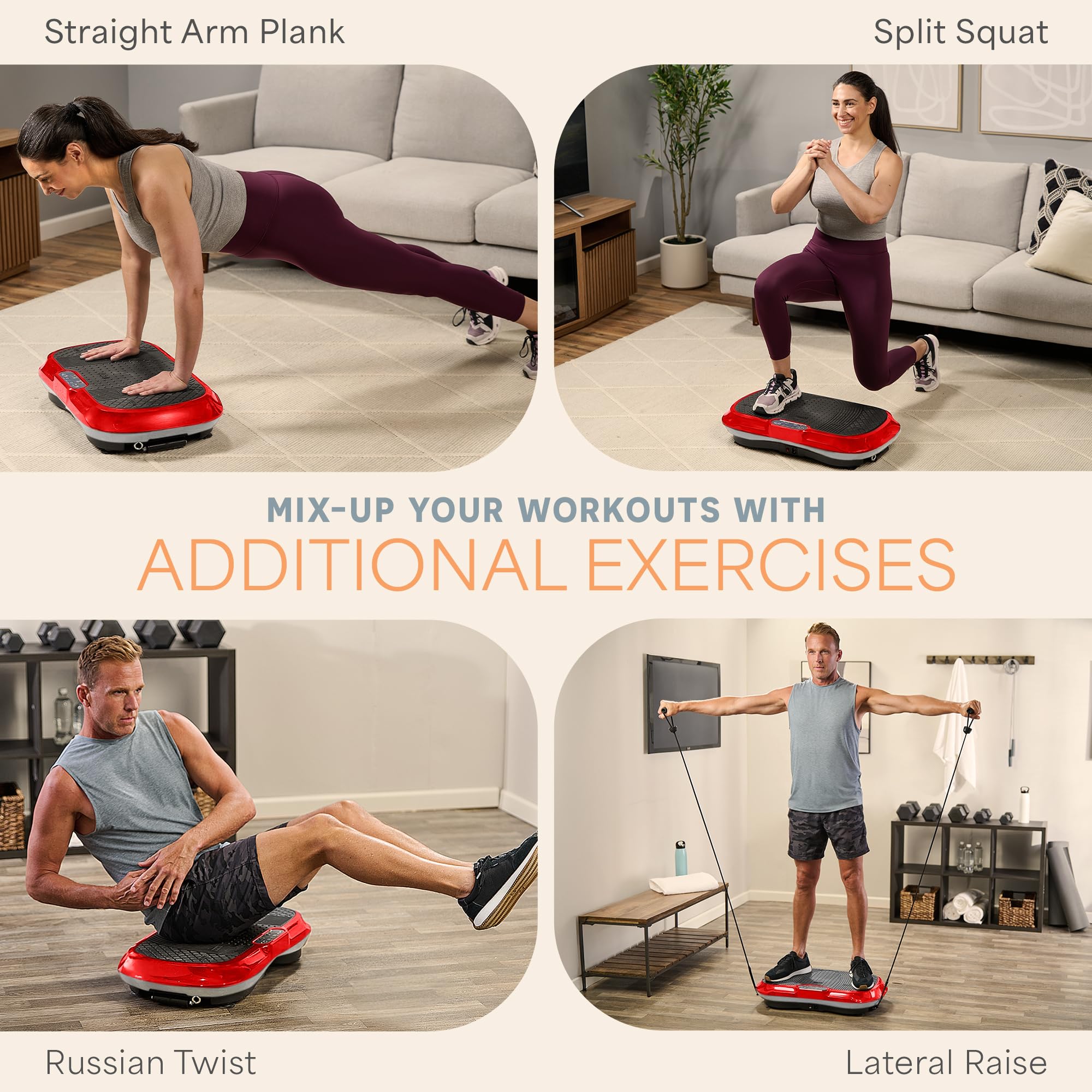 Home Workout Equipment for Oscillation Movement - Through oscillation movement, the Lifepro Waver Vibration Plate Exercise Machine improves muscles, energy balance, circulation, and reduces joint tension. Get started with everything you need, including 2 loop bands, 4 resistance bands, remote control, and user guide. Easily stows away under your bed or furniture.