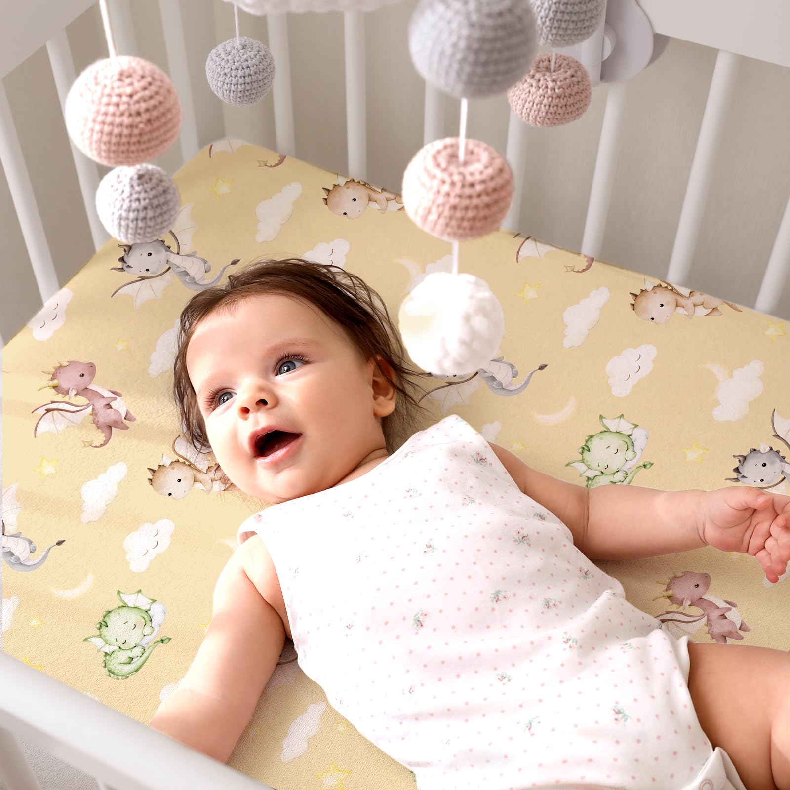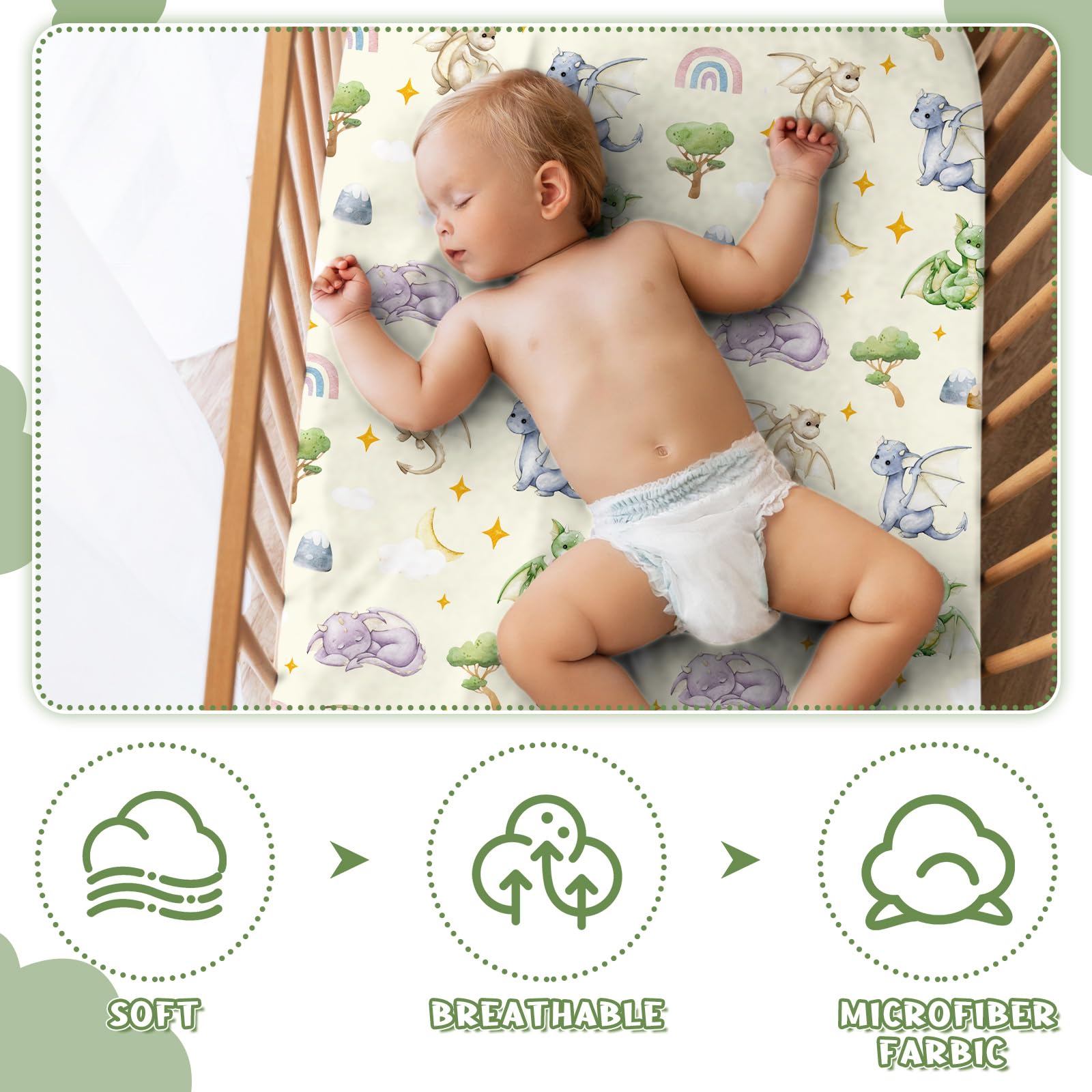 Experience Unmatched Comfort: crafted from a 90g polyester material, our dragon crib sheets fitted offer a supremely comfortable surface for your baby's delicate skin; The quality fabric ensures longevity, resisting continual wear and tear while providing an inviting, soft feeling for your little one