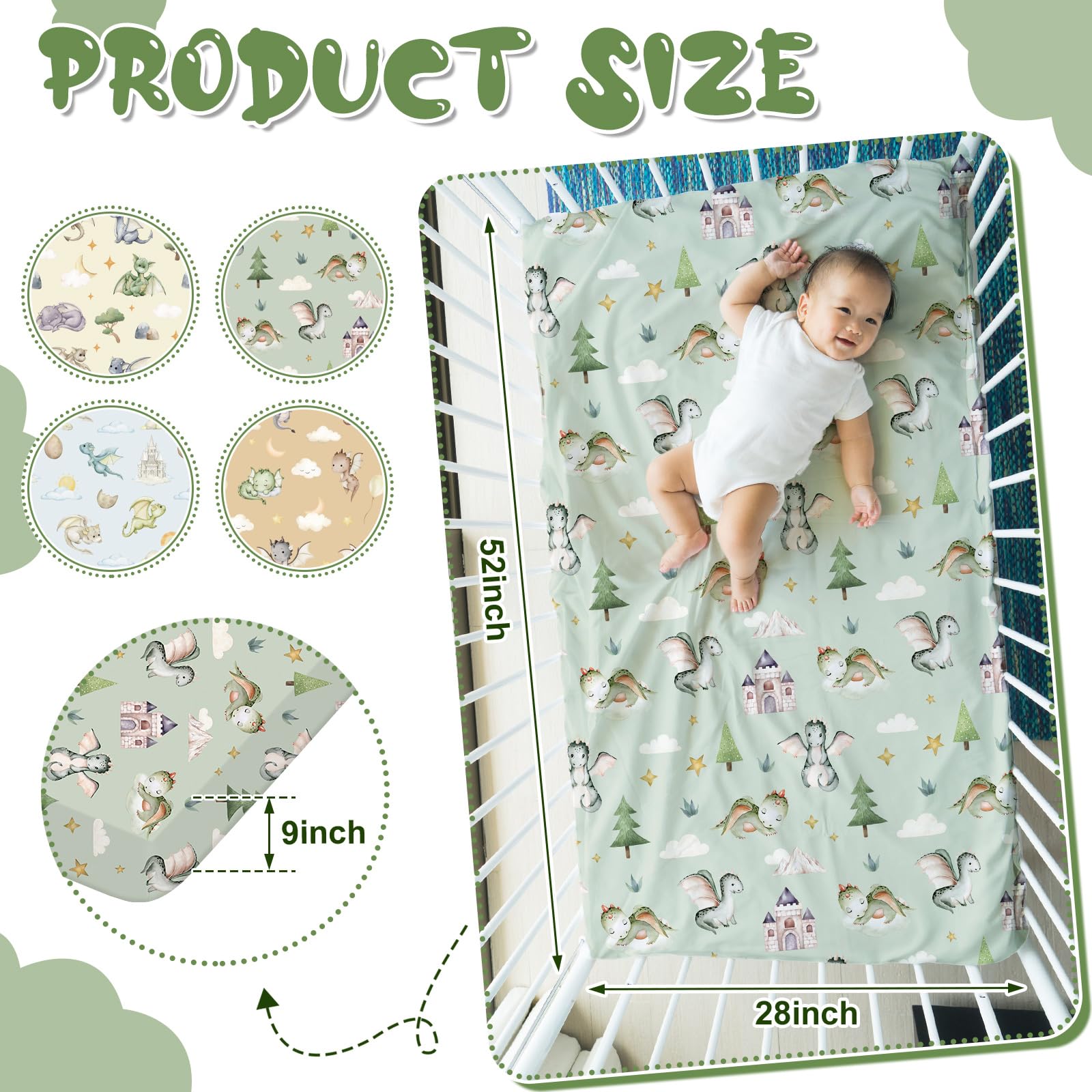 Ideally Sized for Standard Cribs: our dragon nursery decor are designed with standard crib sizes in mind; Measuring approximately 52 x 28 x 8 inches/ 132 x 71 x 20 cm, these sheets ensure a suitable fit, ensuring your baby sleeps soundly without disturbance from sheet movement or bunching; The close fitting design ensures safety and minimizes the risk of loose sheets or suffocation