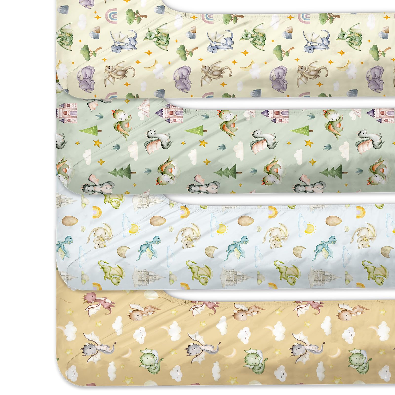 Watercolor Dragon Themed 4 Piece Set: our baby watercolor dragon fitted sheet makes a delightful gift for a baby shower, birthday or holiday and is sure to receive lots of compliments; Our unique designs are created for both boys and girls, while their compatibility with different crib models enhances usefulness; They're ideal for setting the ambiance for fun filled, fairy tale right in your baby's nursery
