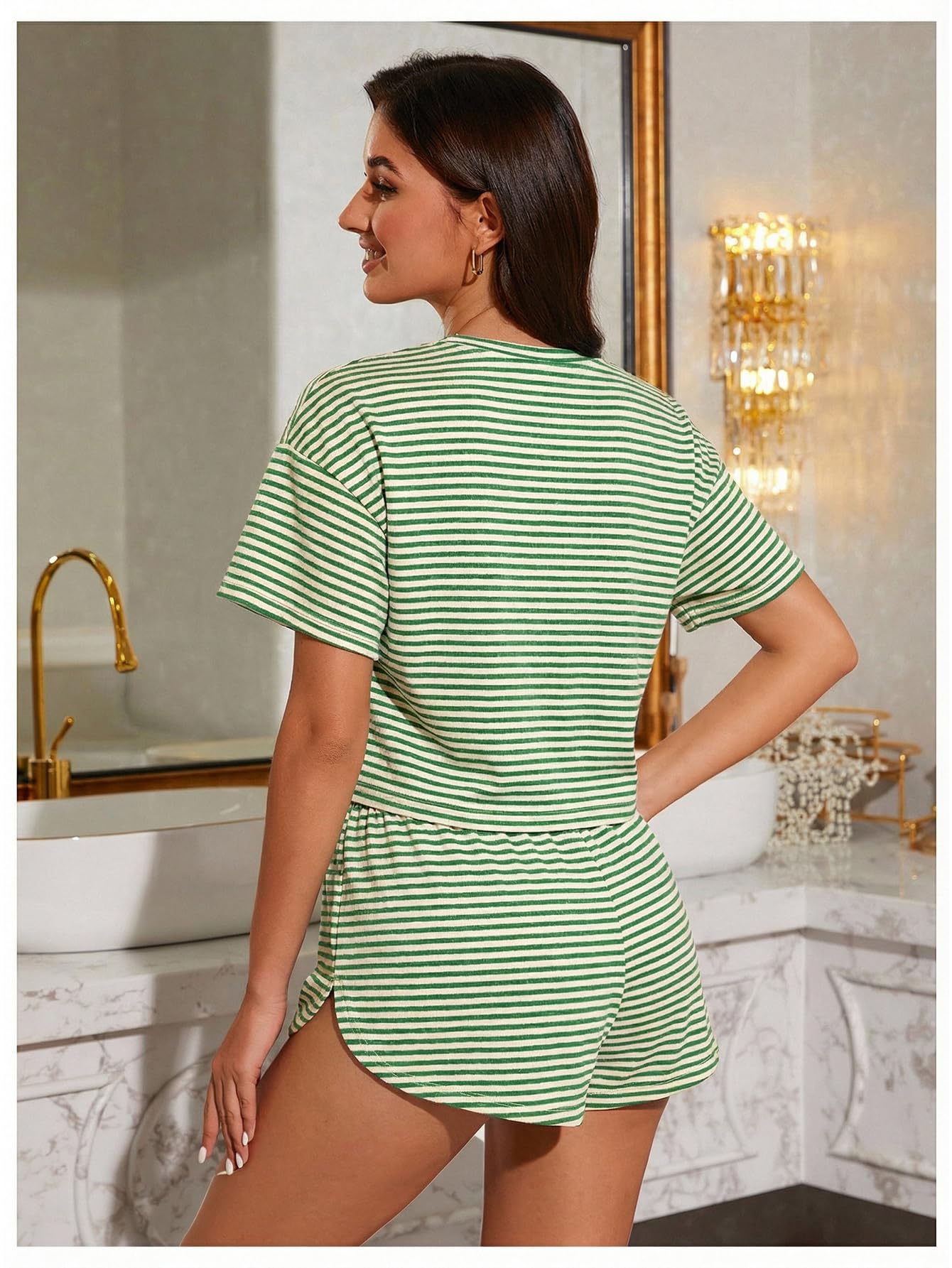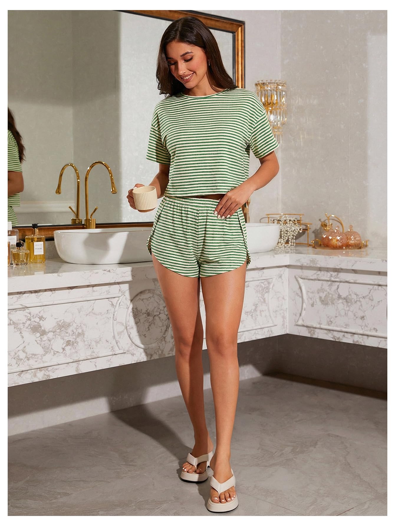 Design: Striped print, short sleeve, crew neck, drop shoulder tee, elastic waist, side split shorts pajama set for women