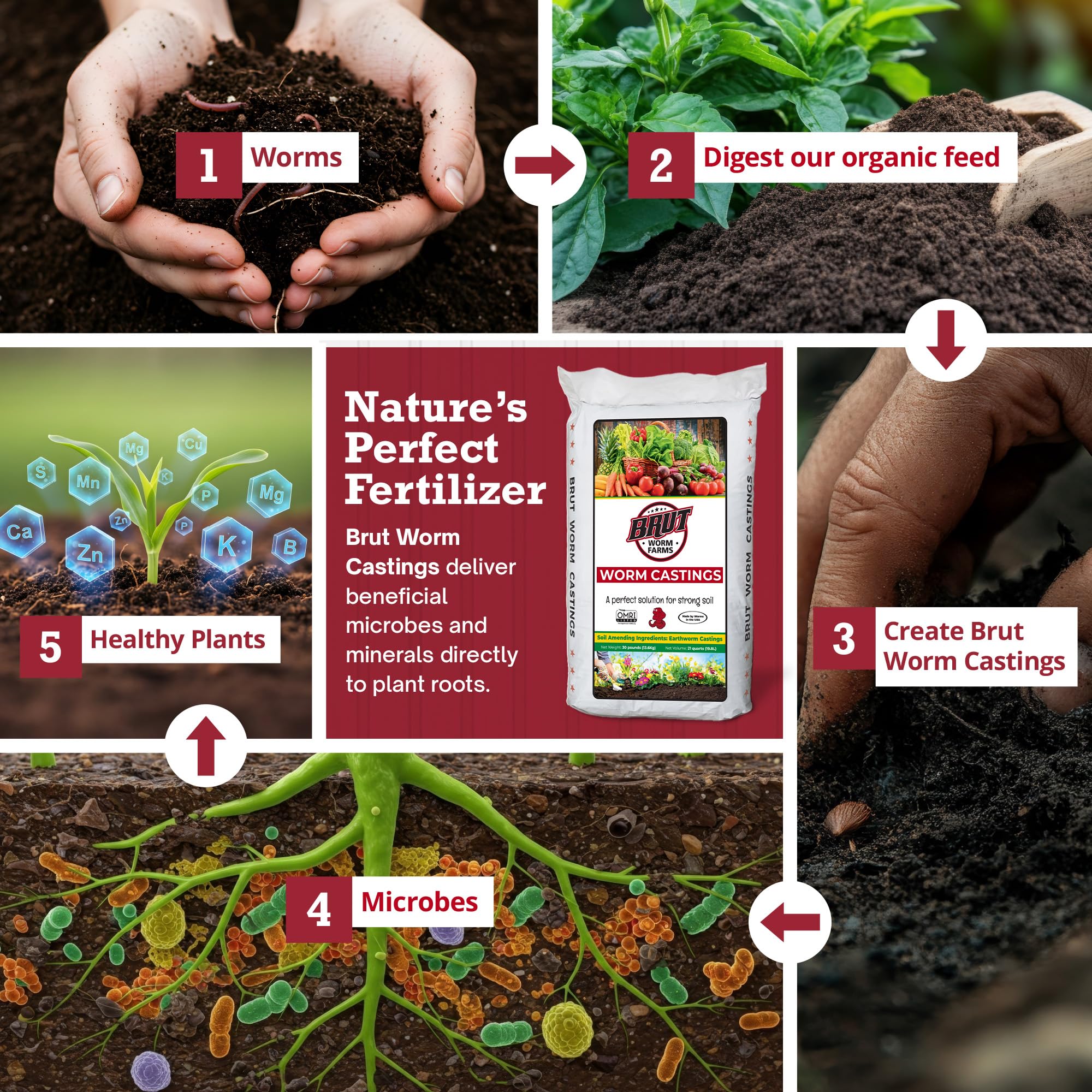 SUPERCHARGE YOUR GARDEN: Elevate your plants' growth with premium organic Brut Worm Castings. Our certified organic formula guarantees optimal nutrition for your indoor and outdoor plants.