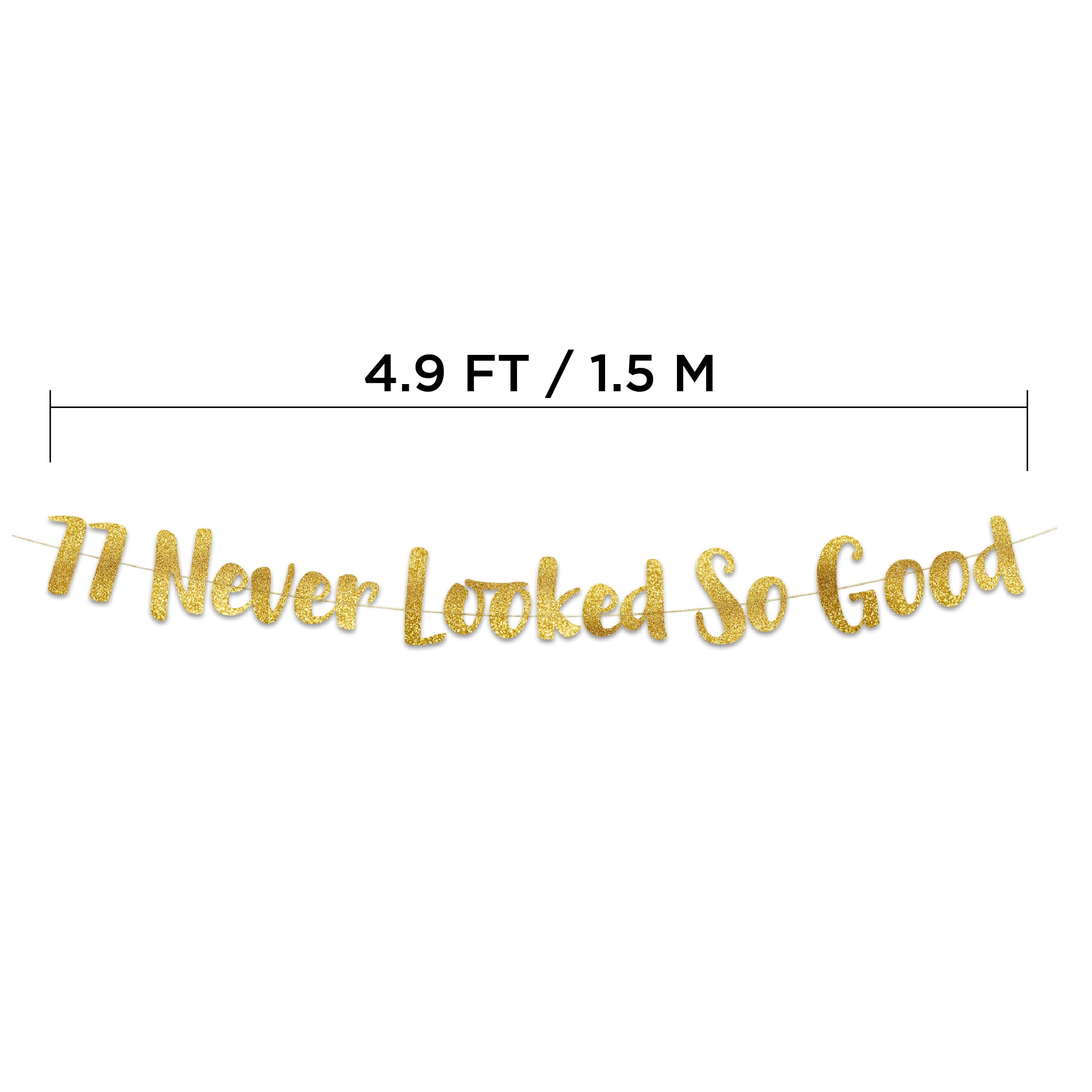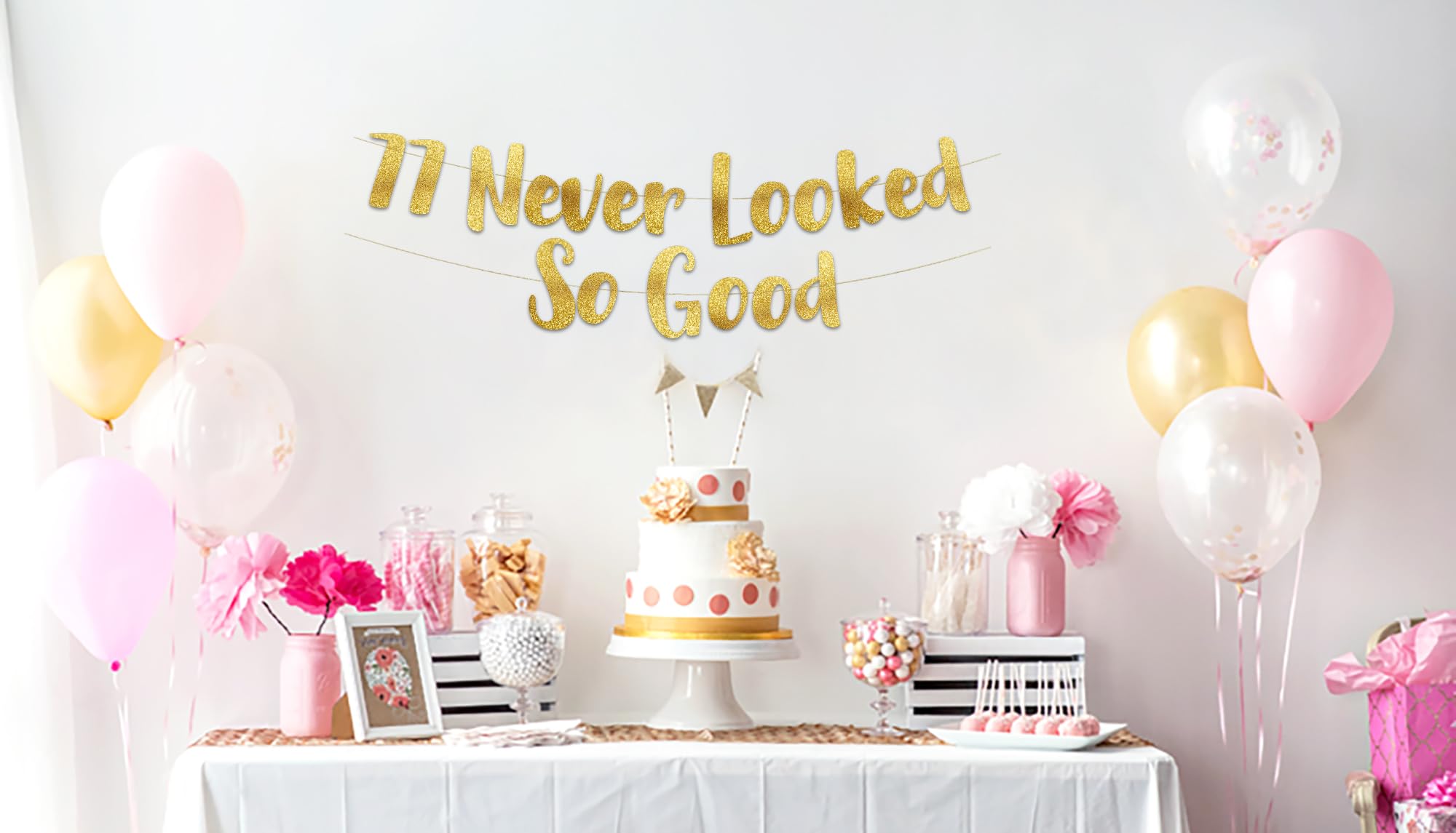 Congrats on 77 years of excellence! This gold glitter banner is the perfect decoration to add a touch of classy decor and welcome your guests to the occasion.