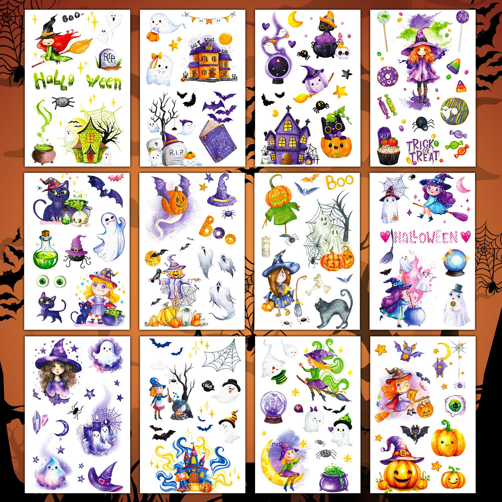 ABOUT PRODUCT: Package Include: 12 sheets Halloween glitter tattoos. High Quality: Our Halloween temporary tattoos can last 5-7 days according to the position you stick it Easy to Remove: 10-20 seconds with just water and easily removed by rubbing alcohol, body oil, olive oil. HOW TO USE: 1.Clean and dry the skin completely. 2.Choose a pattern, peel away the plastic sheet, place the pattern face down on skin and cover with wet sponge for 20-30 seconds. Carefully remove the back paper, now you have a beautiful Temporary Tattoos For Women Men. NOTE: Not intended under 3 years. Do not apply to sensitive skin, near eyes, of if allergic to adhesive.