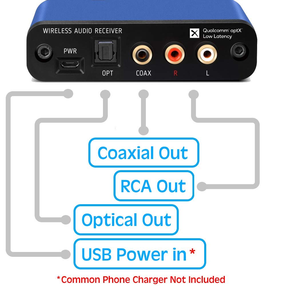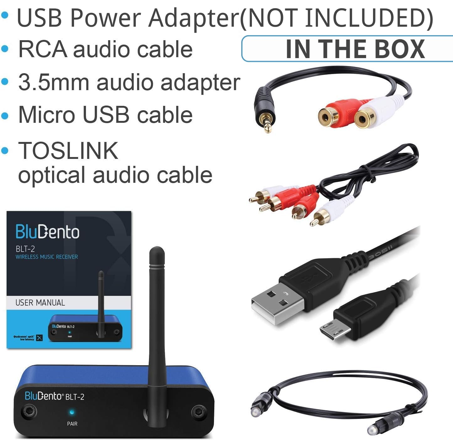 Longer Range Signal with External Antenna + Accessories Included External antenna provides strong, stable Bluetooth range across rooms and even outdoor areas. Includes optical cable, RCA cable, 3.5mm adapter, micro USB cable & manual. (USB power adapter not included.)