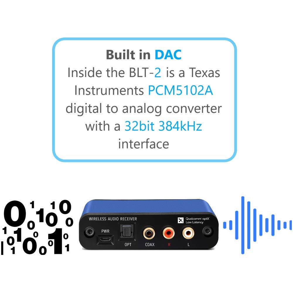 Audiophile Sound with TI DAC (Warm & Natural RCA Output) Built-in Texas Instruments PCM5102A DAC delivers clean, detailed analog sound through RCA. Supports aptX HD / aptX LL / AAC / SBC for high-quality Bluetooth audio.