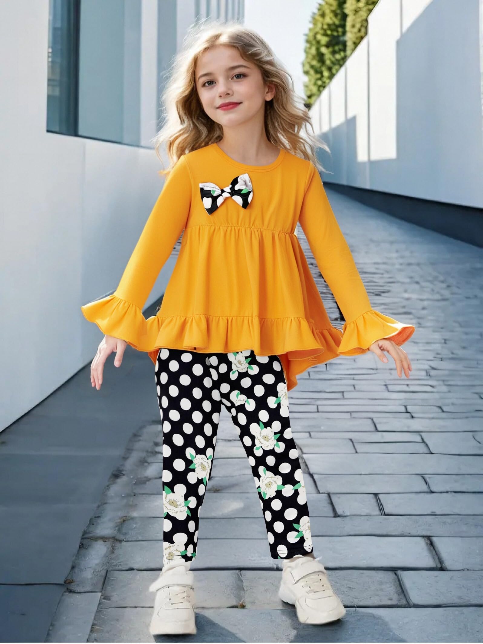 Unique design - bell sleeves Ruffle high low Bowknot solid top + floral polka dot printed leggings with a delicate and stylish shredded bow design, these girls trousers will bring joy to your little one and she will get so many compliments she won't want to take them off.