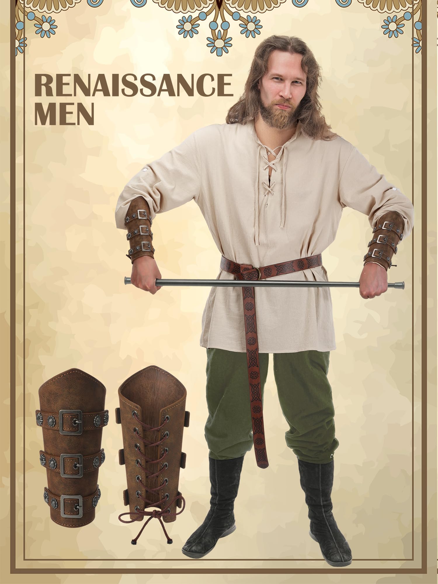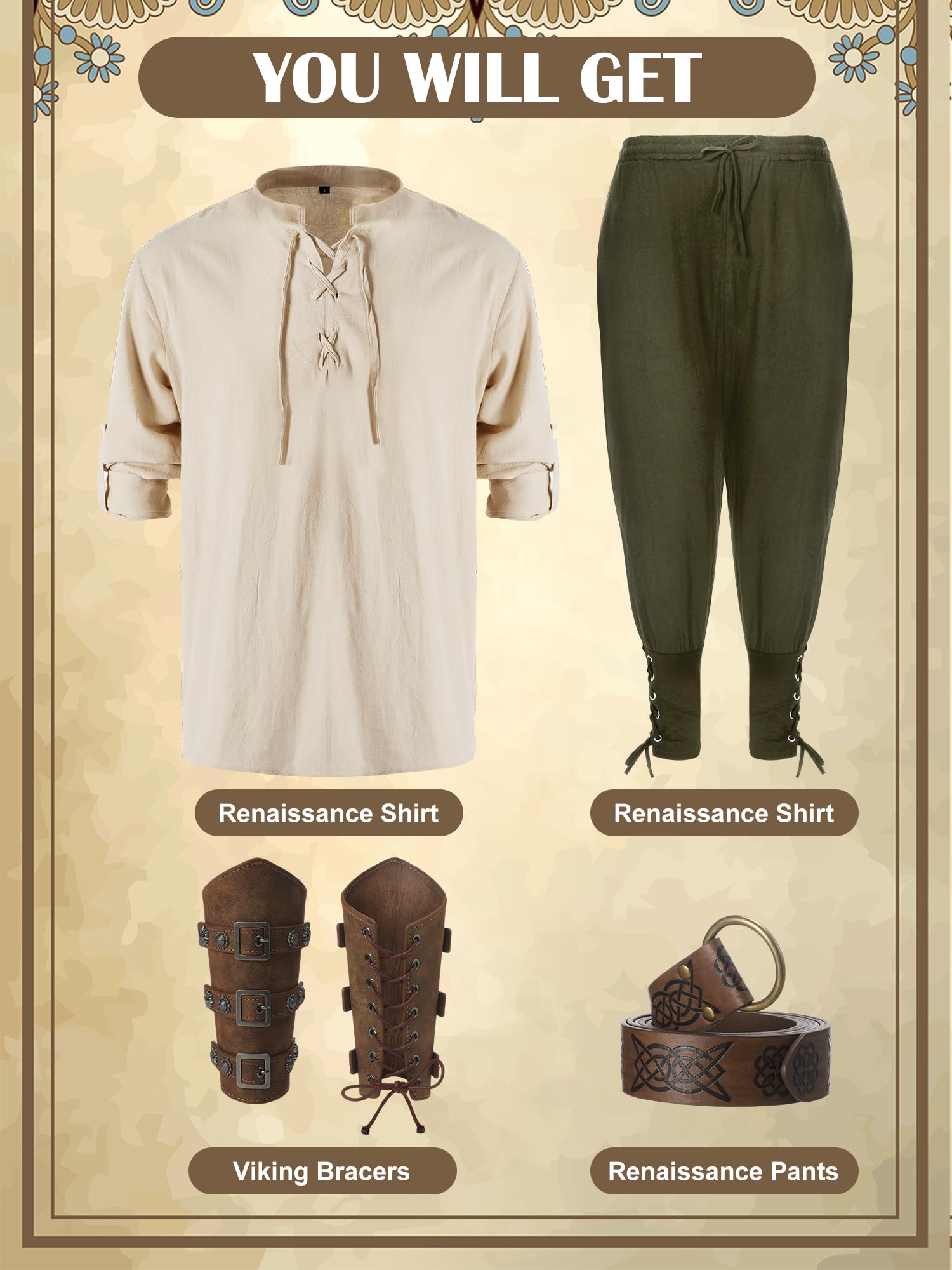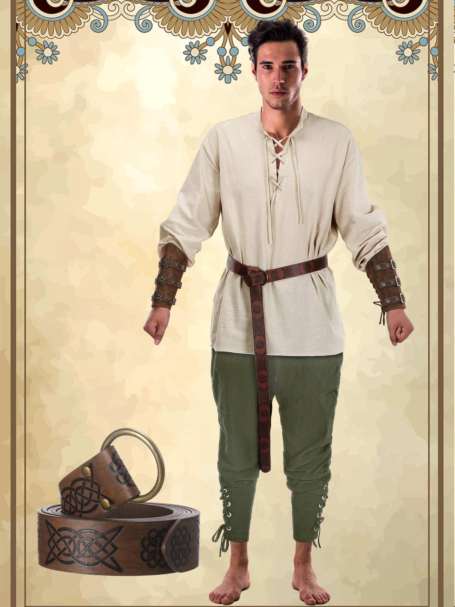Nice Combination: the set includes 1 cotton retro style lace long sleeve shirt for medieval, 1 pair of renaissance gothic trousers, 1 medieval knight's belt and 1 pair of leather buckle wrist guards, nice for Halloween cosplay party