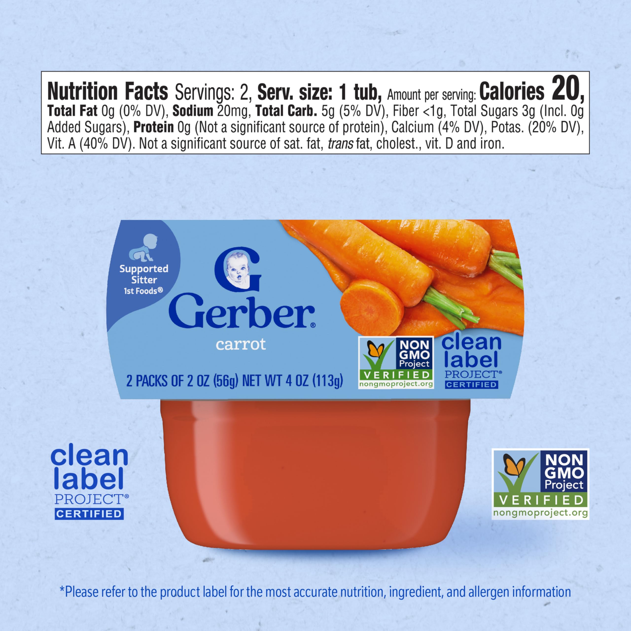 Gerber Stage 1 Baby Food, Carrot Puree Tubs are a premium choice for your child’s early stages. Crafted to help support their nutritional needs, along with meeting the busy lifestyle needs of caretakers and parents. Each baby puree tub is made in a portable, easy-to-store format – making it perfect for life’s busy moments. This stage 1 baby food puree is designed for babies who are able to sit with help or support and are ready to start solids. Gerber understands the importance of providing wholesome ingredients during the crucial developmental stages of your child's life -- that’s why these tubs are Non-GMO Project Verified. This vegetable baby food puree has no added salt, and no artificial flavors or colors. They need to be refrigerated after opening and must be used after 1 day. Gerber baby puree is ideal for parents who seek a convenient and high-quality option in their baby's diet.