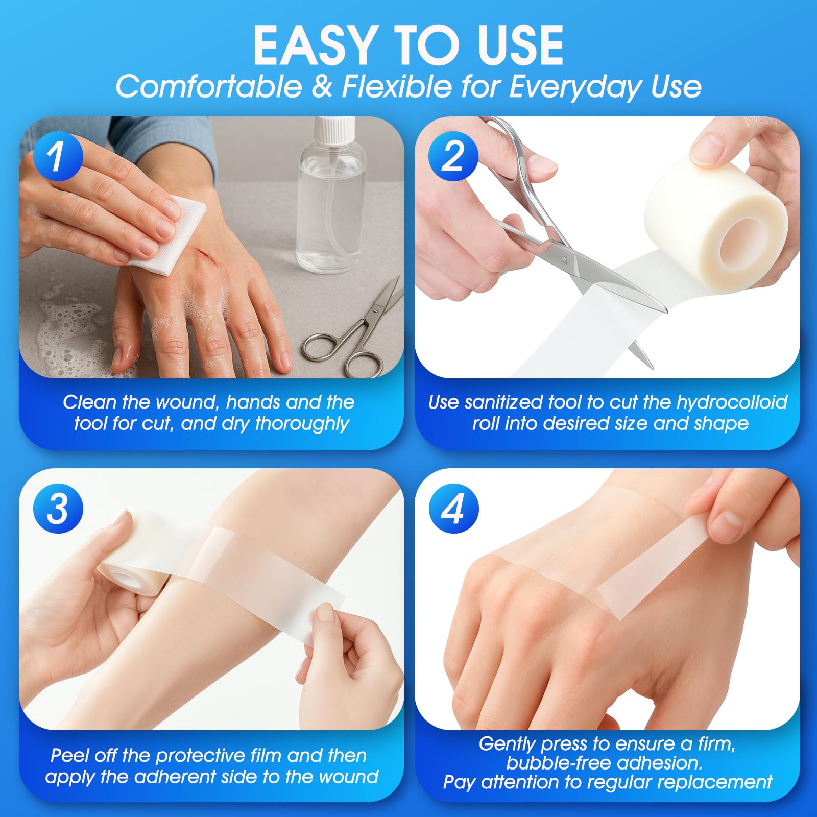 ✂ Instant Custom Fit & Full Coverage: Forget hydrocolloid patches that never fit. This medical grade hydrocolloid roll cuts to any size—big or small, round or strip—so every hydrocolloid dressing conforms perfectly to your skin, even on elbows, knees, or fingers. 93% of testers reported trimming their own shapes was “faster and more precise” than relying on pre-cut hydrocolloid patches.