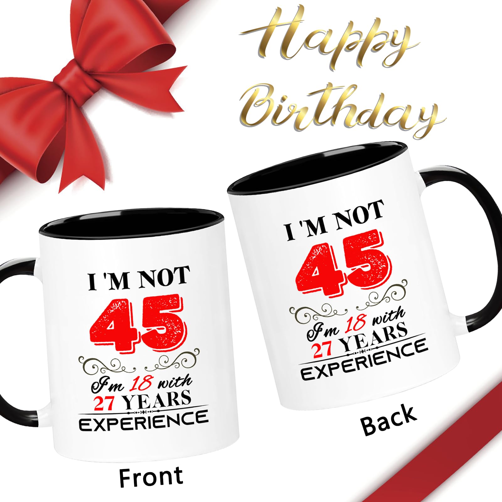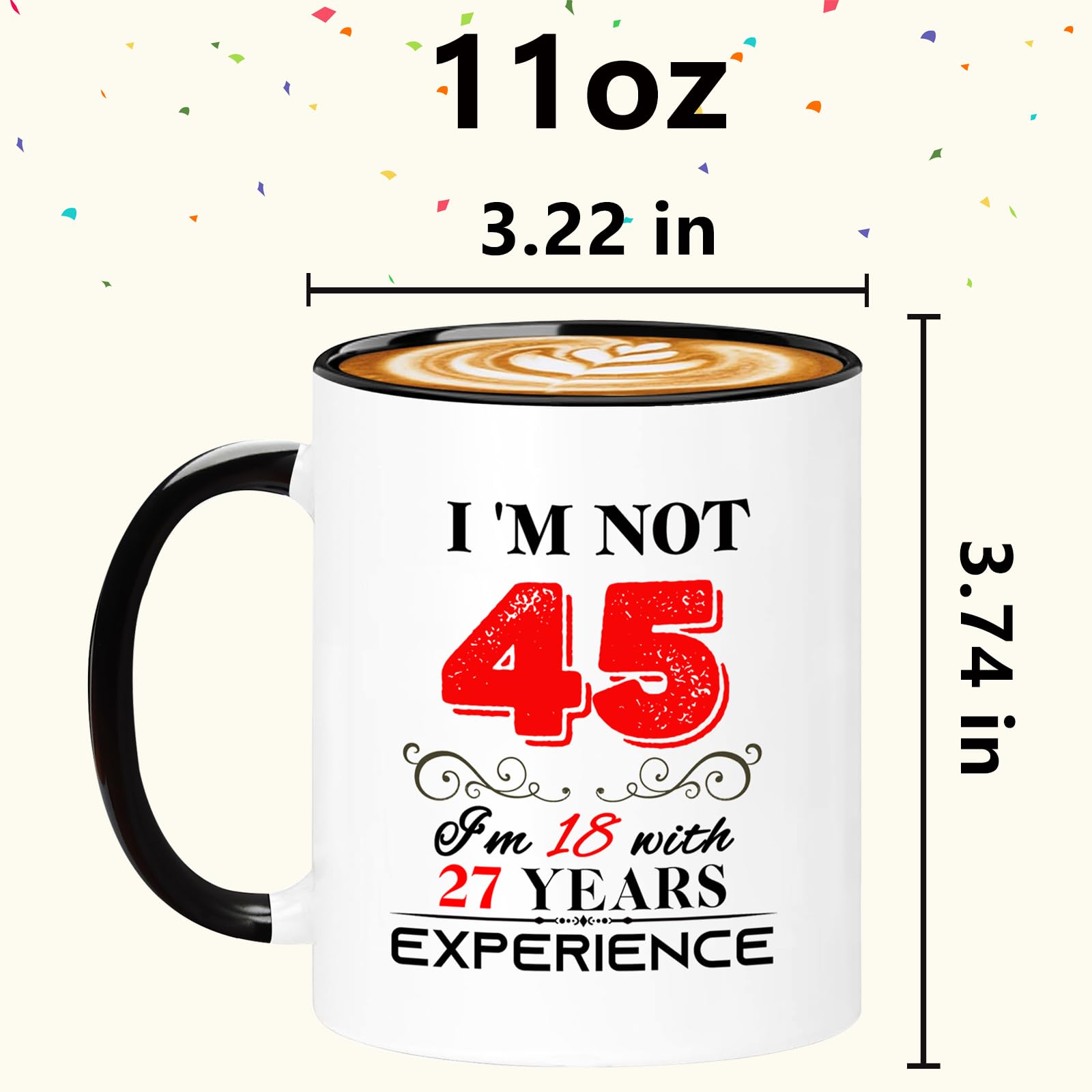 【Birthday Gift】: This funny "I'm not 45, I'm 18 with 27 years experience" Mug is the perfect birthday gift for a 45 year women men! Give it to your mom, dad, papa, mama, brother, sister, husband, wife, aunt, uncle, cousin, son, daughter, boyfriend, girlfriend, boss, coworkers, bestie, granddaughter, or your best friend for her he birthday.
