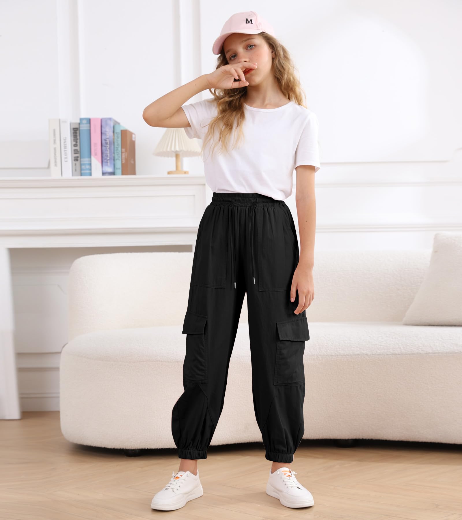 Design: Girls parachute cargo pants are loose-fitting, elastic waistband with drawstring, classic tapered pants, multiple pockets, elastic ankles, and available in a variety of colors