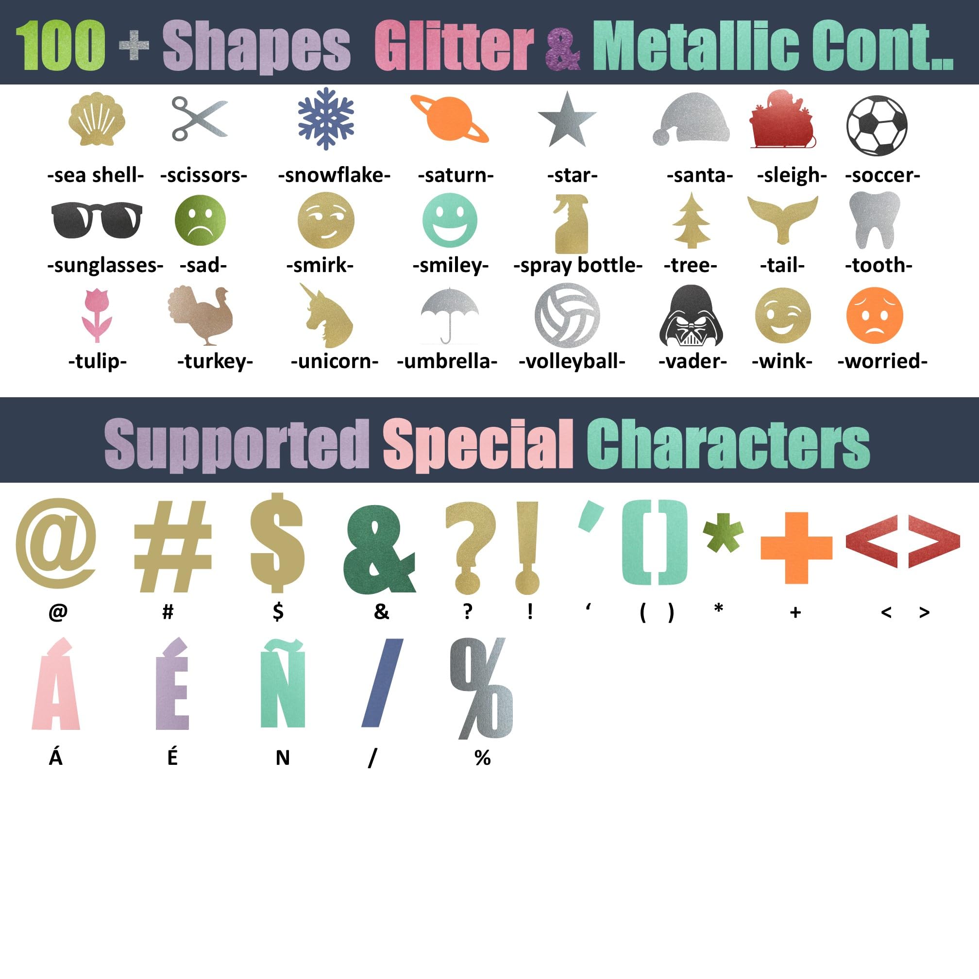 * Available characters: [A - Z] [0 - 9] and 50 + shapes as shown in the product images. Shapes must be specified as -shape name-