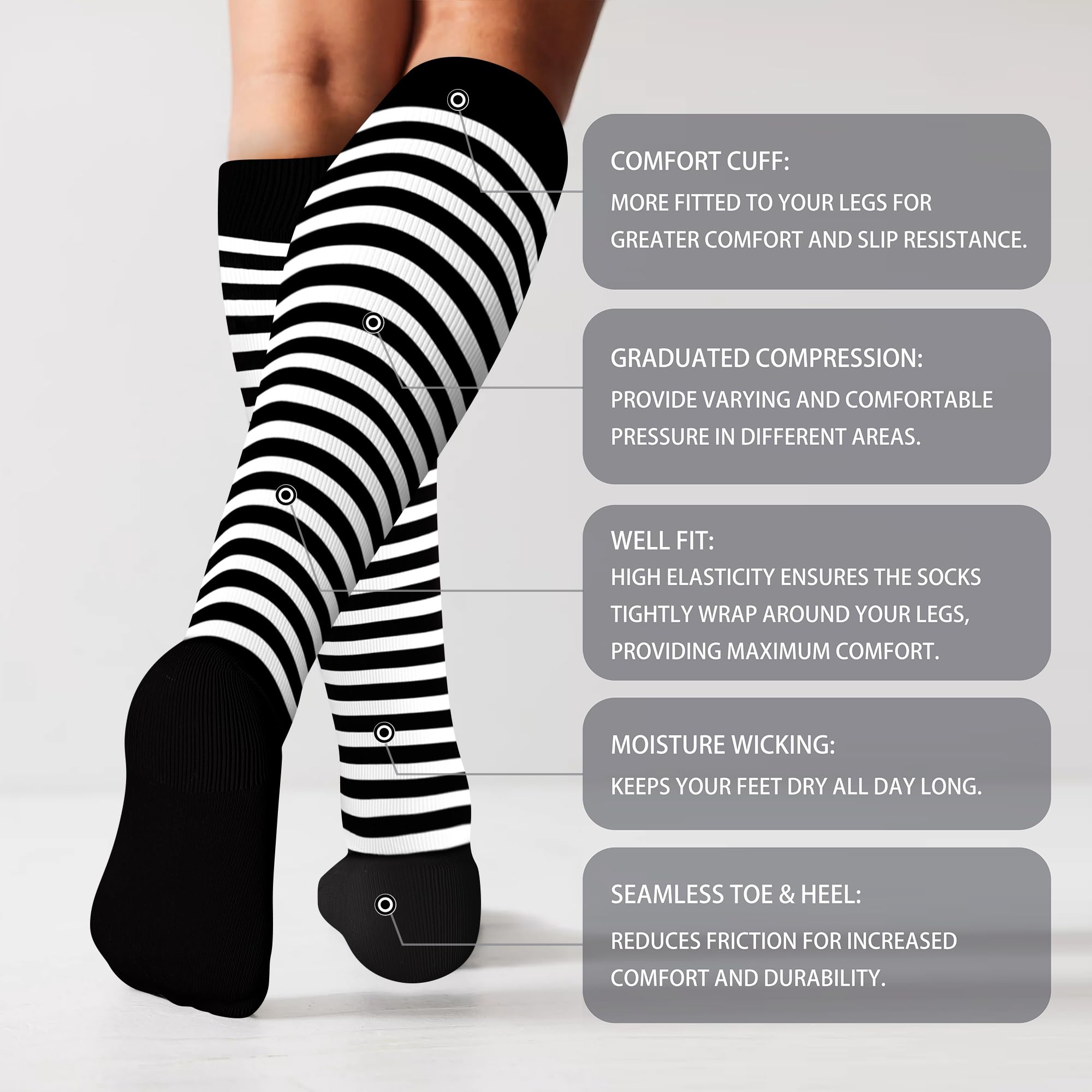 Graduated Compression Socks: Compression socks 20-30mmHg knee high provide comfortable and appropriate pressure from the ankle to the calf, effectively promoting blood circulation in the legs, caring for your leg health, and keeping you comfortable all day long.