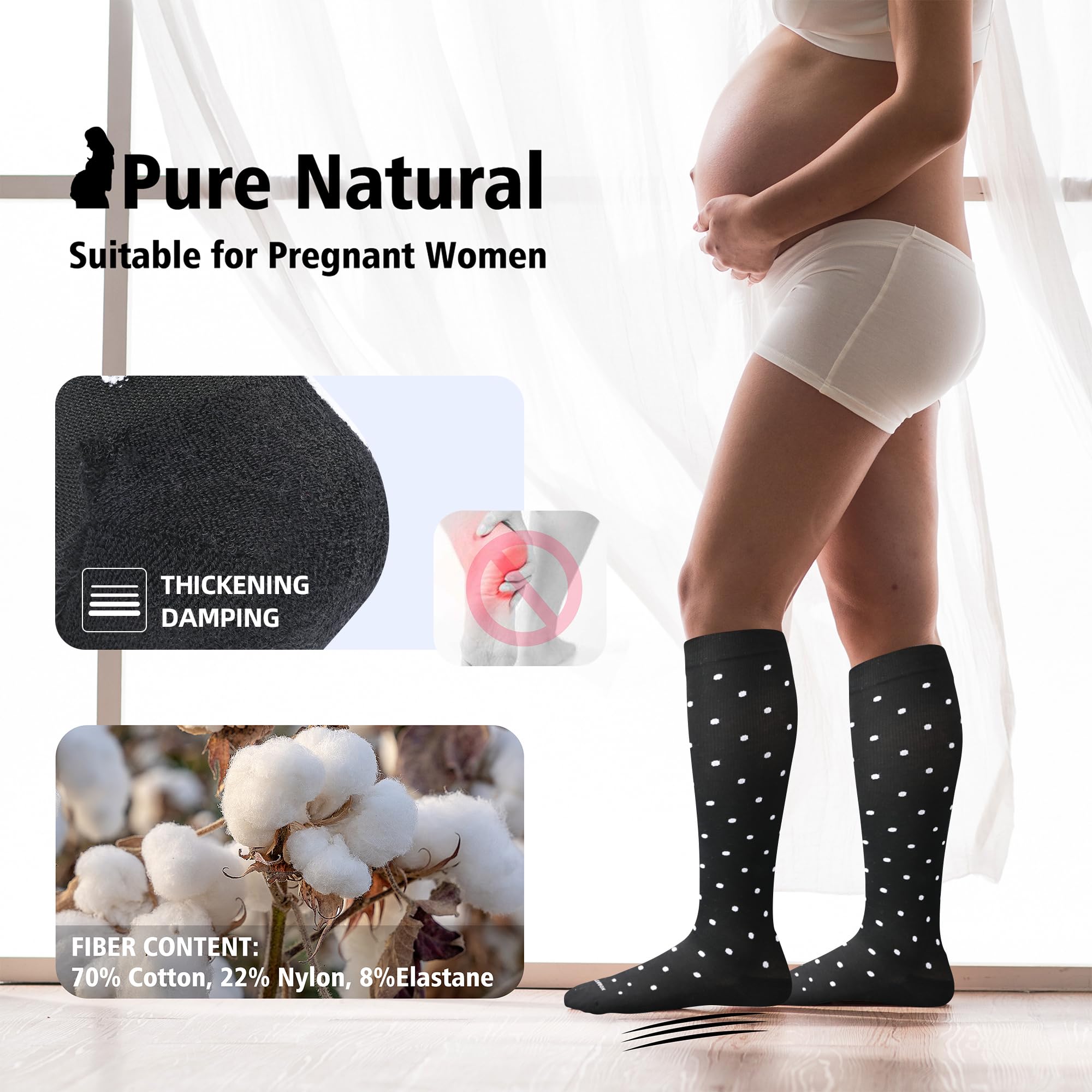 Multifunctional Compression Socks: Compression socks for prenancy&nurses effectively address leg-related issues, prevent blood clots and alleviate fatigue, ease swelling and pain during pregnancy, and provide support to eliminate fatigue and boost leg vitality. They are suitable for nurses, pregnant women, those with long shifts, travel and flight.