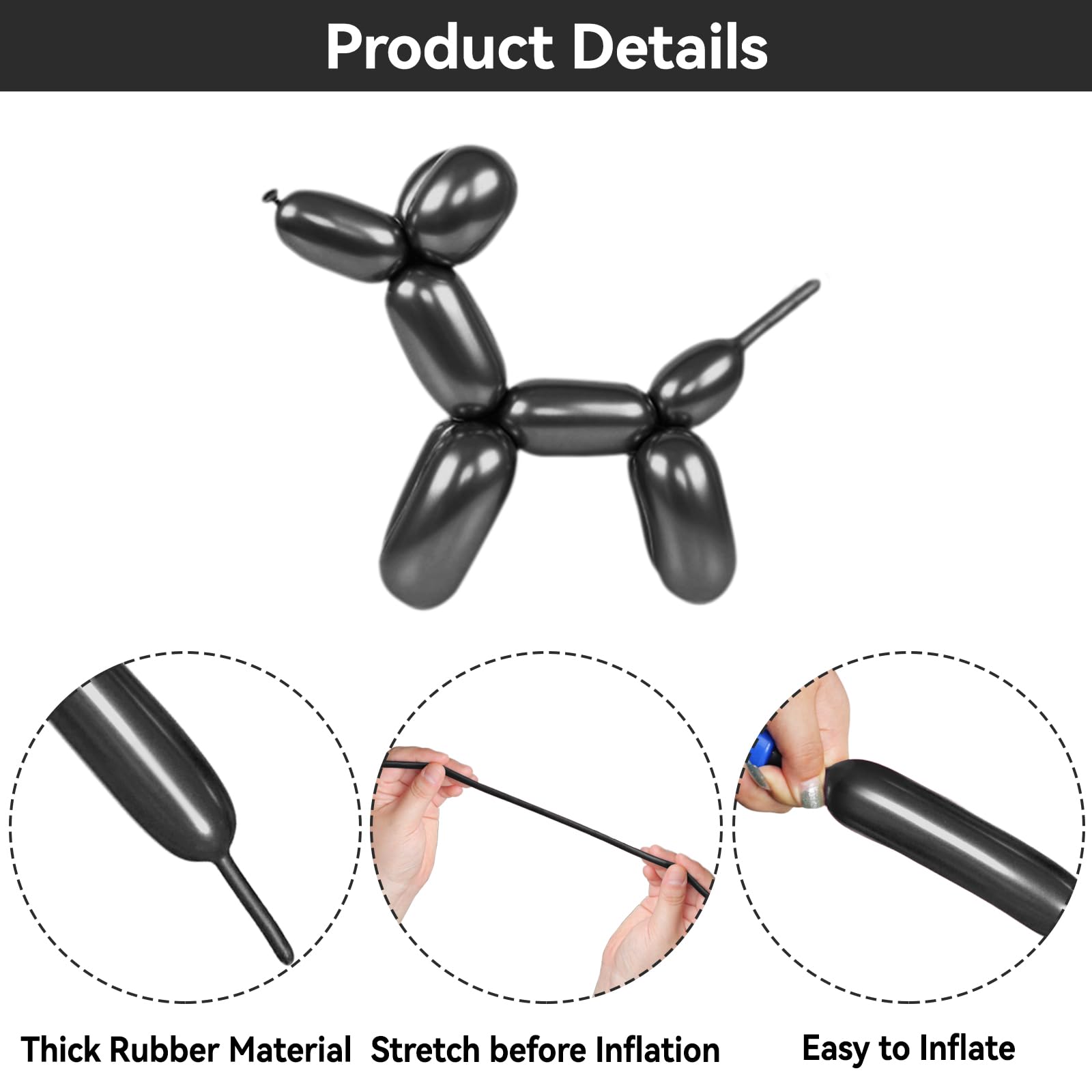 BALLOON ANIMAL BALLOONS: The length of the twisty balloon is 12.5 inches, and it can be inflated to 47-53 inches. It can be easily inflated with balloon pump or an electric pump.