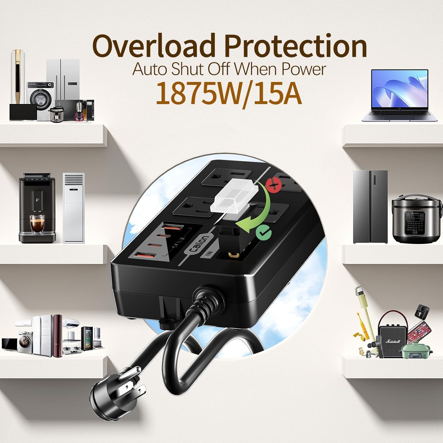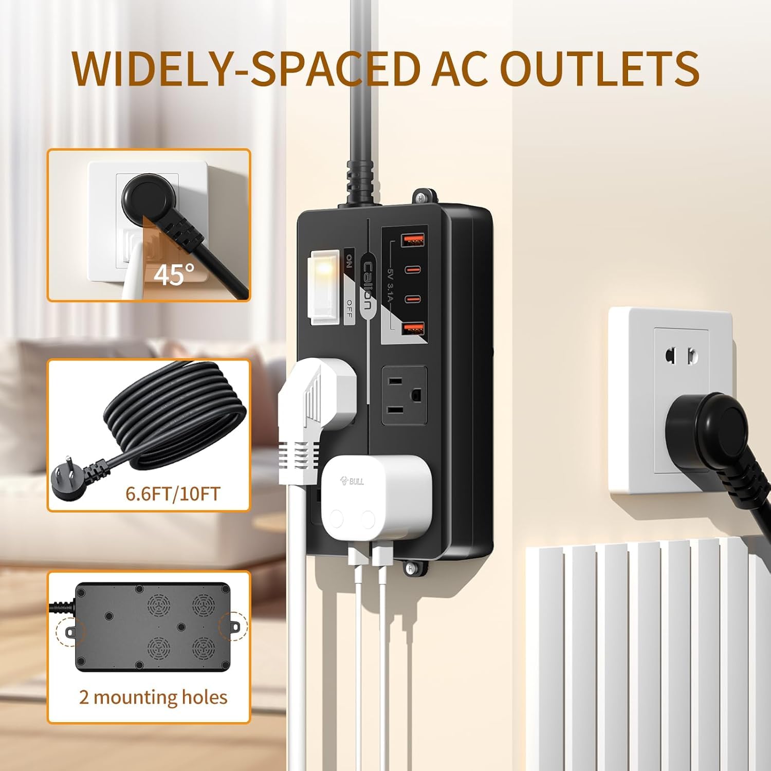 4 Wide-Spaced Outlets + 4 USB Ports - Fits large plugs and charges devices (2 USB-A, 2 USB-C); powers up to 8 items like string lights, pumps, or phones simultaneously.