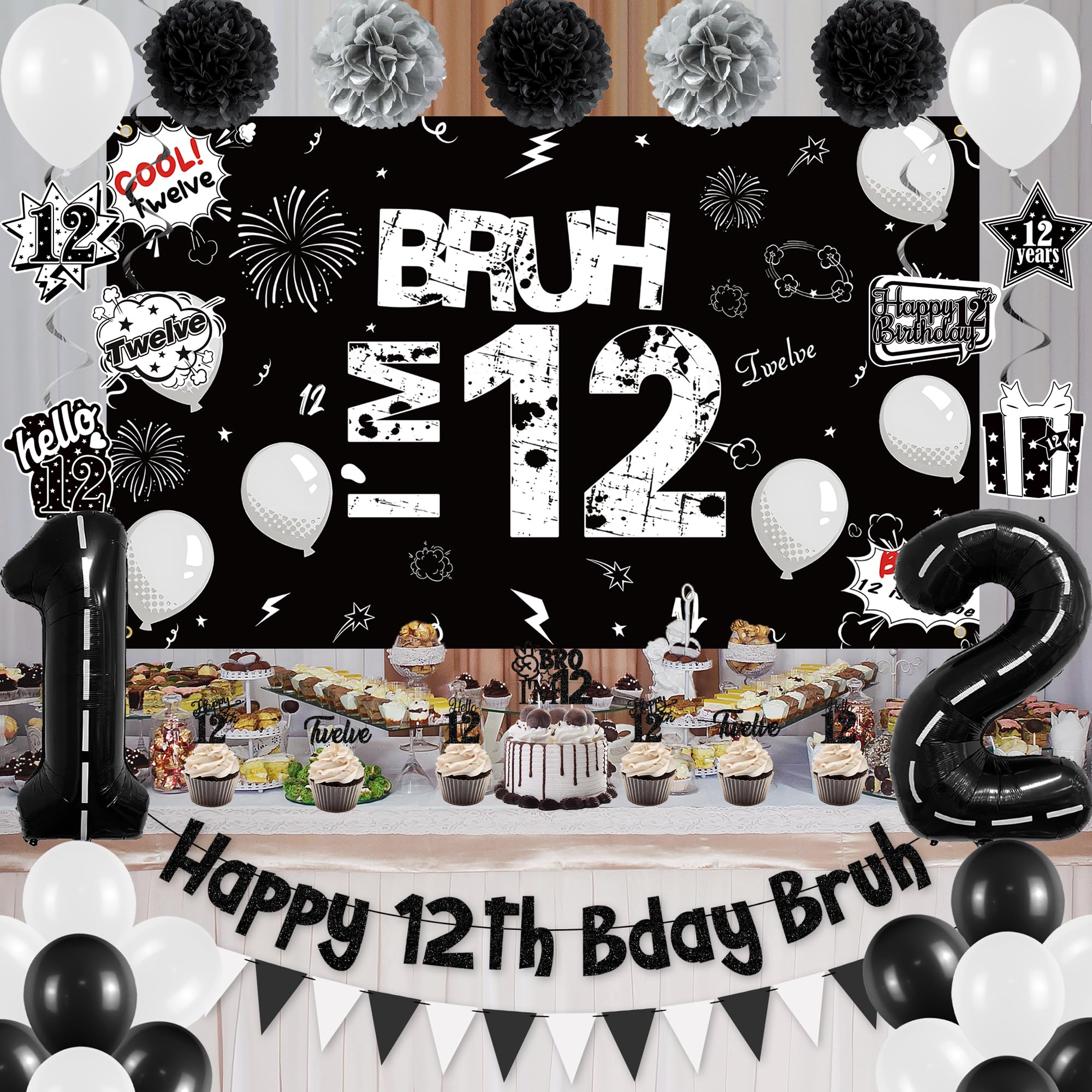 Happy 12th Birthday : Includes 16pcs 12-inch latex balloons, 2pcs 40-inch number 12 aluminum foil balloons, 1pcs "Happy 12th Bday Bruh" birthday banner, 1pcs black and white triangular flag, 5pcs paper flower balls, 6pcs black and white 12th birthday card spiral hangers, 1pcs 12th birthday cake top decoration, 6pcs cupcake top decorations, 1pcs black "Bruh I'M 12" background. This 12th birthday decoration set will add fun to the 12th birthday party.