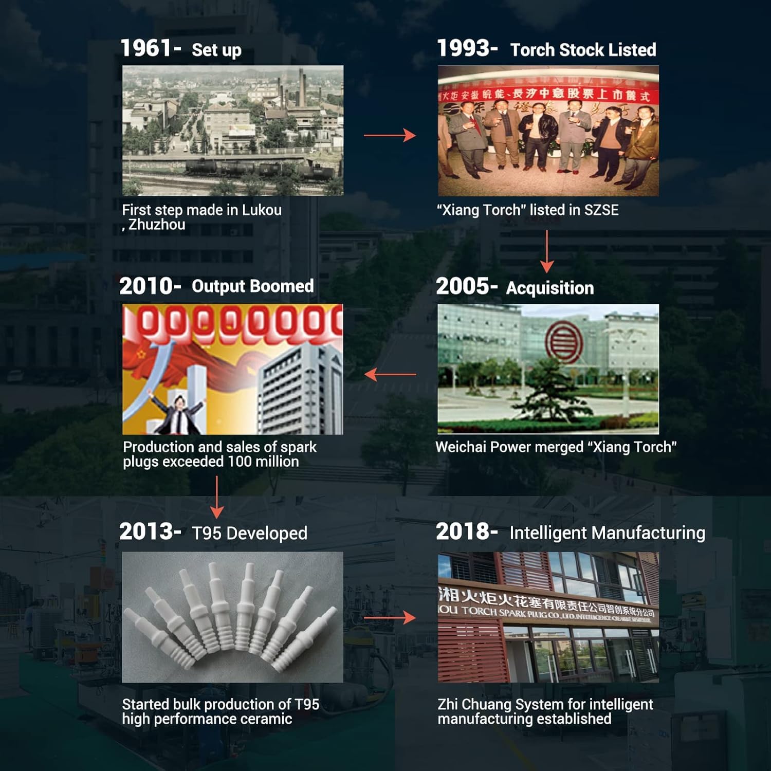 🟢LONG HISTORY - In 1961, Zhuzhou torch spark plug. Co.,ltd. was established at Lukou, Zhuzhou, CHINA. In 1993,TORCH was listed as Shenzhen stock exchange. In 2003,TORCH has become china’s largest spark plug production and R&D base. Subsequently, TORCH bought the full set of equipment and technical patent from DELPHI U.S.A. Spark plug factory, ride into the forefront of the world!