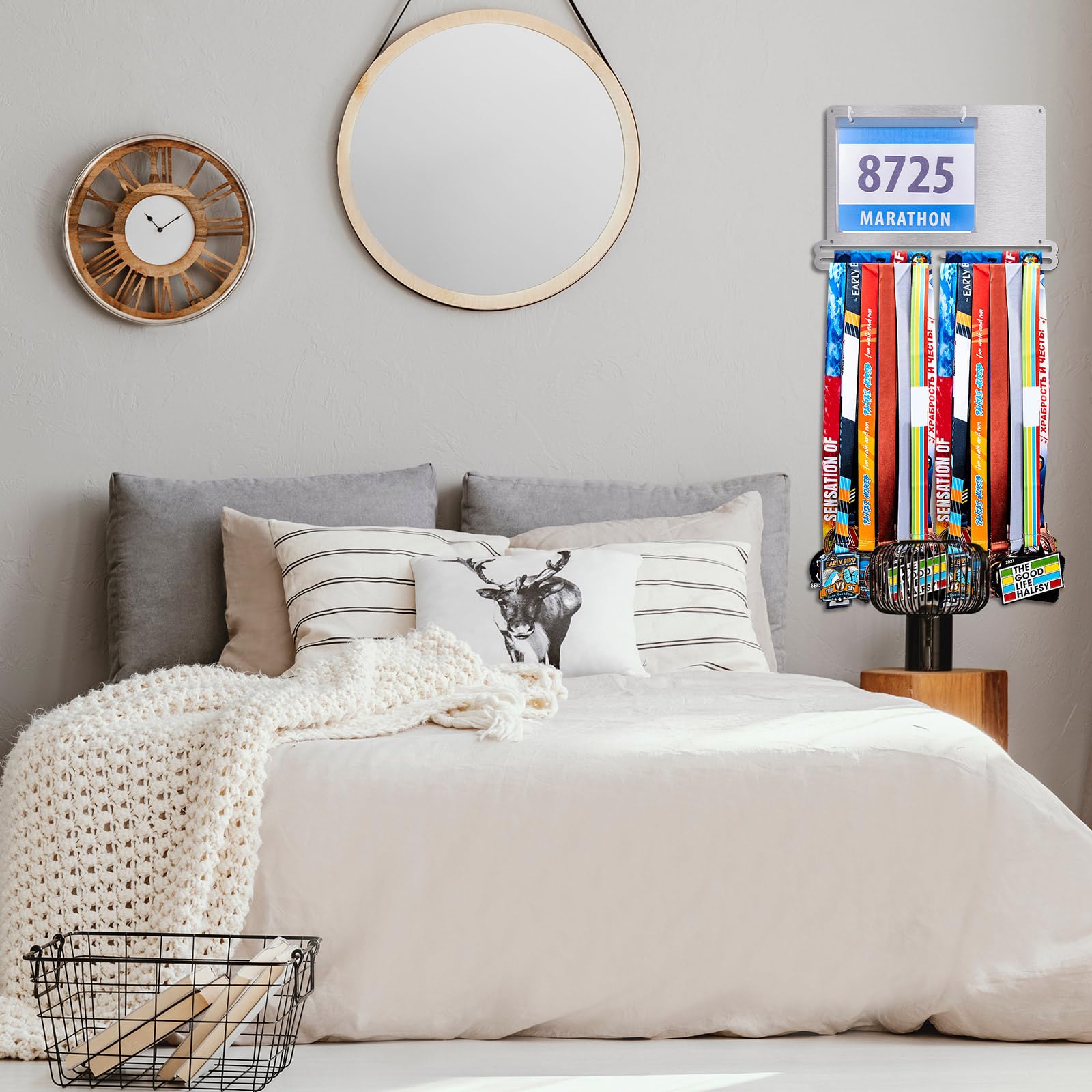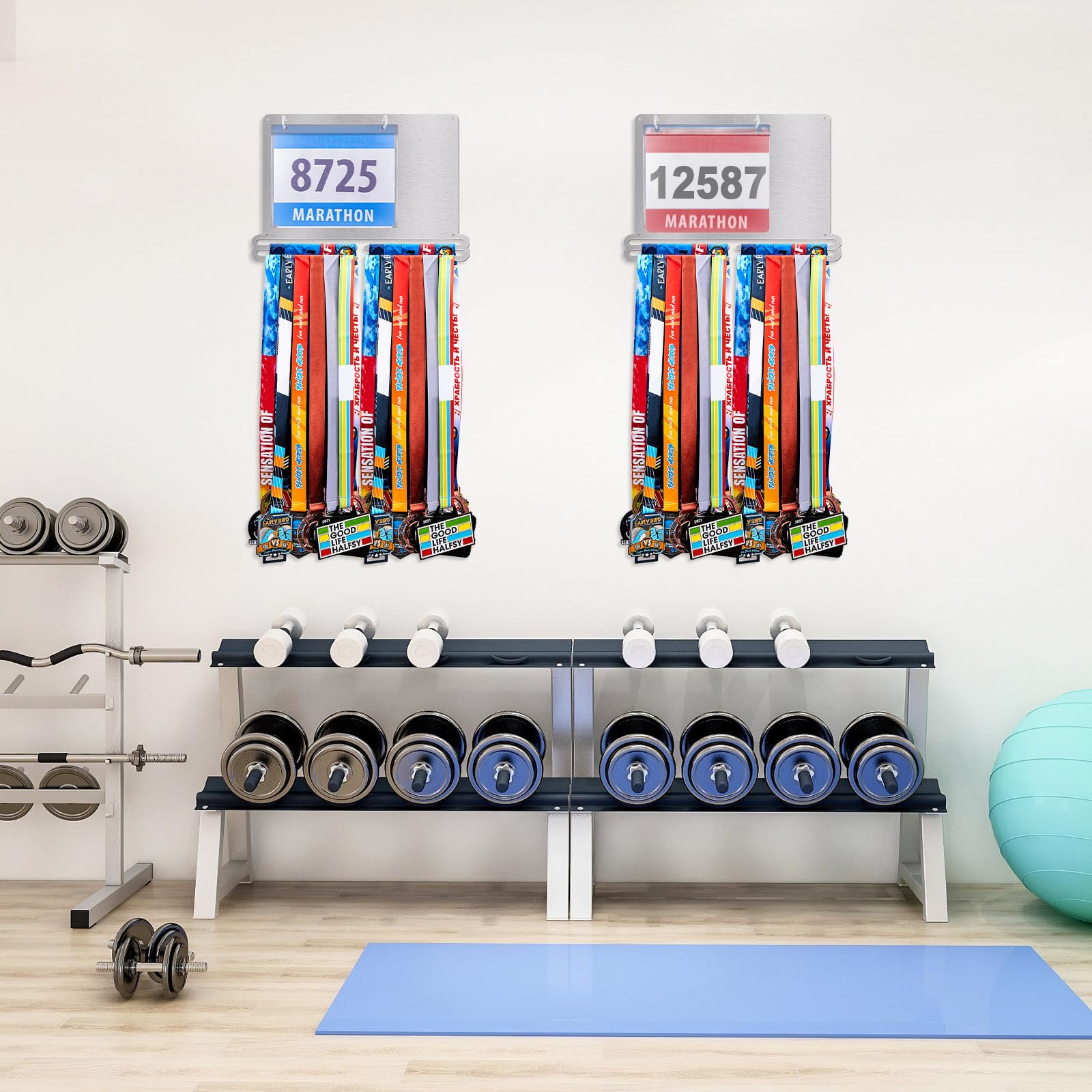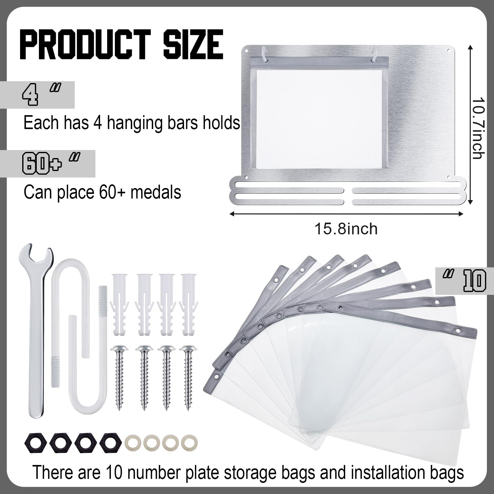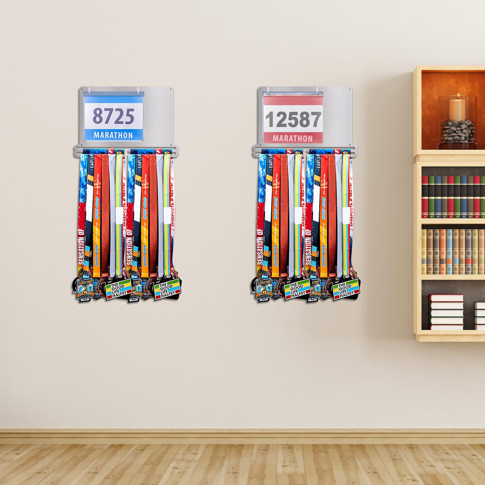 Convenient to install: the race medal display rack is designed for wall mounting to maximize space and keep your medals and bibs organized, the package comes with the appropriate mounting kit, you simply attach the rack and screws to the wall, then place the medals in the plastic bibs and hang them on the hooks, slide your medals onto the bars