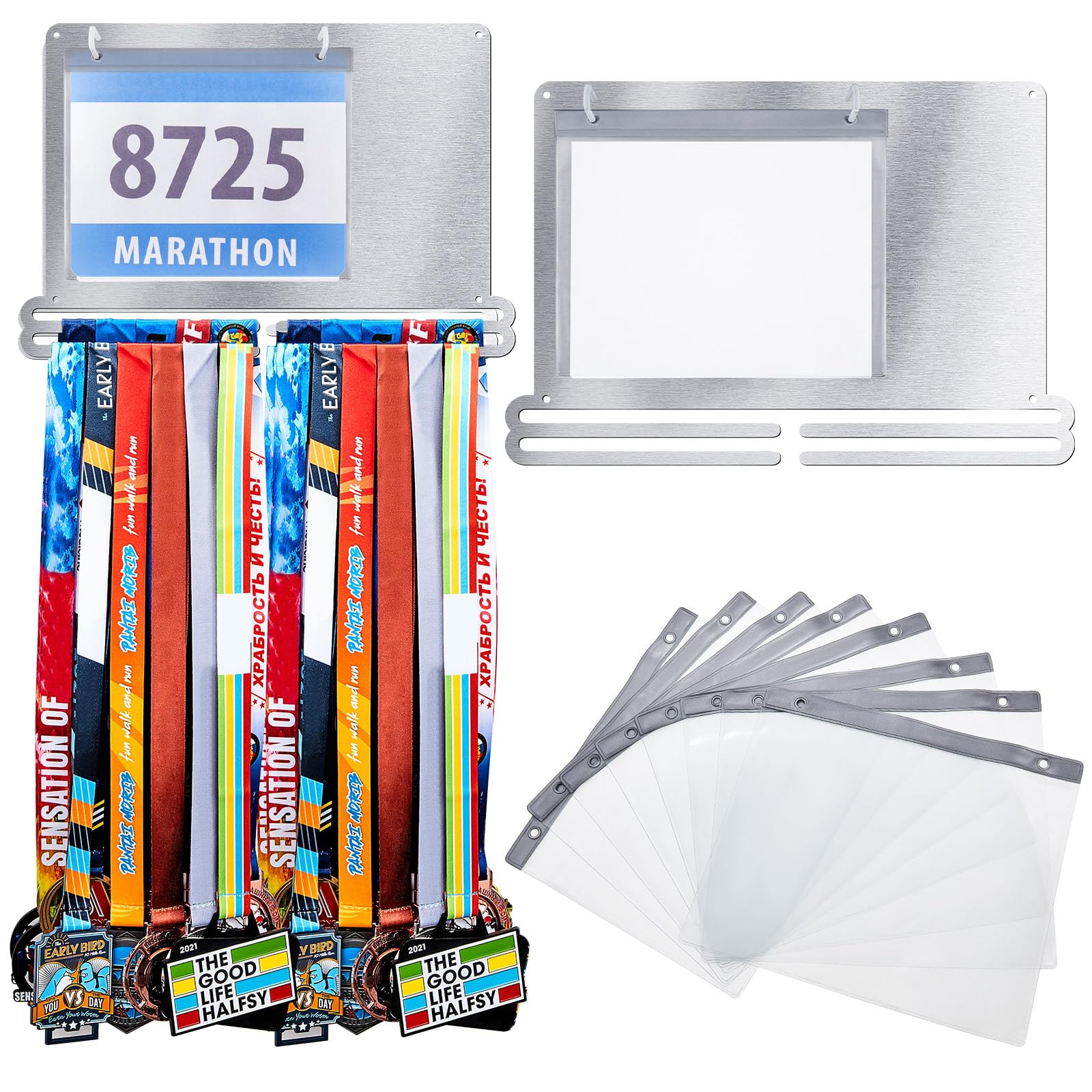 Package Content: the package comes with 1 piece of race medal and bib display with 10 pieces race bib holder pouches, and the size is approx. 15.8 x 10.7 inches, at least 20 number plates and 60 medals can be stored, enough quantity and practical design to meet your various needs for medal storage