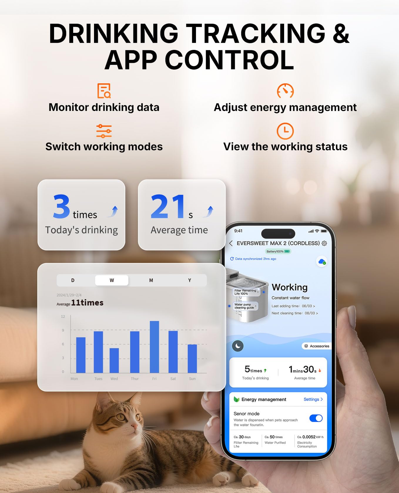 Wireless Cat Drinking Fountain: PETKIT upgraded Eversweet max 2 cordless cat water dispenser, no need to plug in, you can place it anywhere: kitchen, bedroom, balcony, etc., bring you a new feeling; 5000mAh high-capacity battery, service life up to 83 days! No more worry about your cat or dog running out of water during power outages or short trips! When the fountain is short of water, the pump will automatically stop working to prevent the device from burning out.