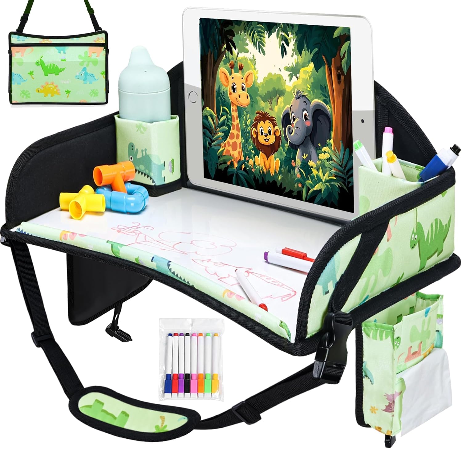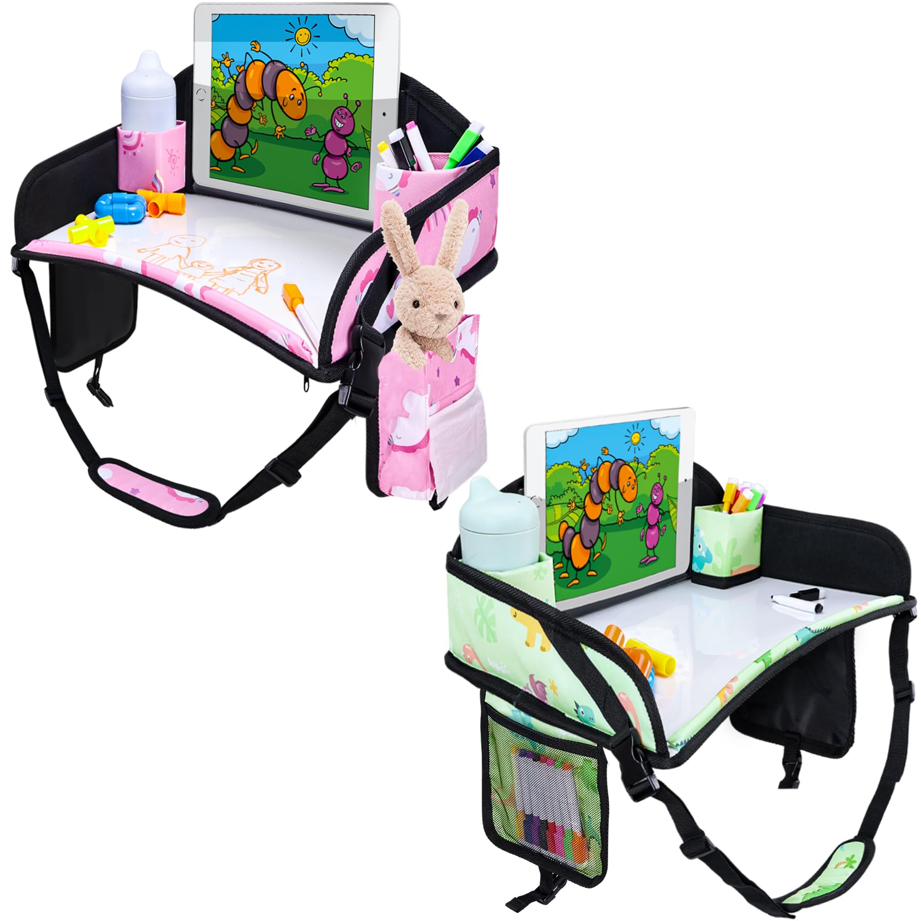 Multi-Function Travel Tray For Kids Car Seat: Multiple mesh storage pockets keep your child’s toys, snacks and water bottle organized and within reach. The dual-purpose adjustable strap secures toddler travel tray in place and be used as a convenient carrying strap for travel