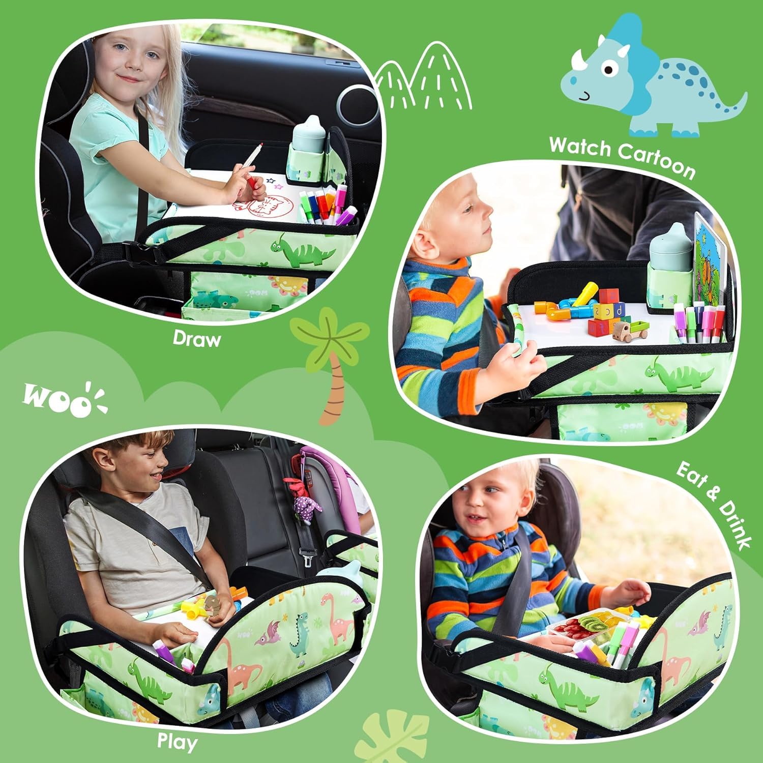 Easy to Clean: Made of five layers of material, the 600D Oxford material ensures a lightweight yet tough quality. Toddler car tray surface of the product adopts a wipeable panel, which means that any marks left by kids eating or drawing on it can be easily wiped away without having to worry about getting dirty and difficult to clean