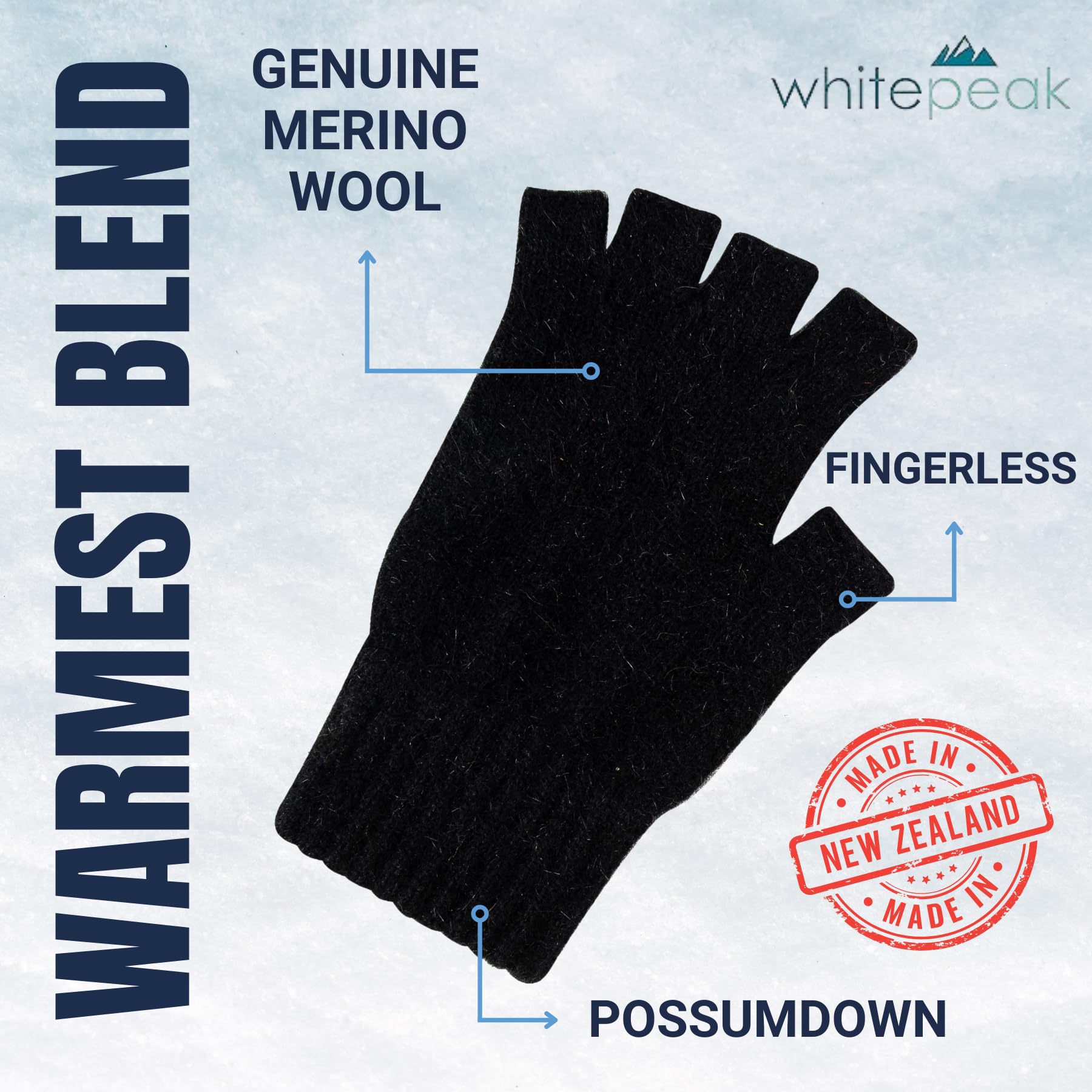 Description ""Nature’s Most Innovative Blend. These incredibly soft and warm fingerless gloves are designed by carefully blending the fibers of real Merino wool and Brushtail possumdown. This authentic blending of two incredible natural fibers was first developed in 1992 by a New Zealand knitter, and the incredible texturing of these uniquely New Zealand materials has stood the test of time. Warm, Light, and Cozy: Nature’s Most Incredible Combination. Pure, genuine Merino wool provides an incredible barrier to the elements, while offering a truly soft and unique skin-feel. Brushtail possumdown offers additional protection through it’s hollow-core fibers that combine a natural cushion of insulating air to protect from extreme temperatures. Incredibly, both natural materials tend to draw moisture away from the skin, rather than trapping it below the surface like most other materials. So enjoy a material that is as warm and protective as it is comfy and light. **WASH CAREFULLY** As with EVERY real wool garment, these fingerless gloves must be hand-washed in cold water and surface dried on a flat surface. ADD TO CART NOW, and don’t forget to pick up a pair of our Merino wool and possumdown gloves to complete this incredible experience!""
