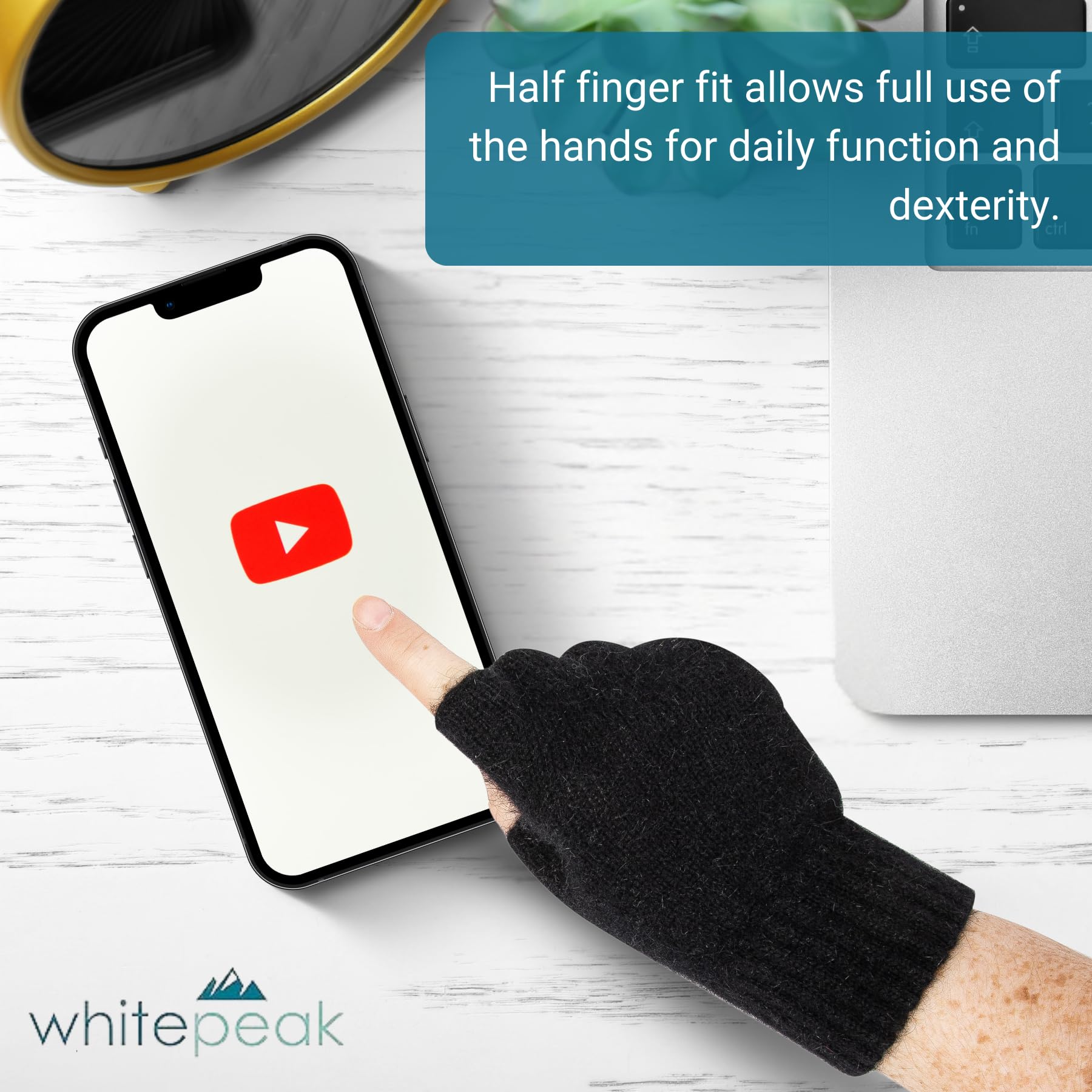 KEEP YOUR HANDS FRESH AND DRY, WHILE MAINTAINING DEXTERITY. Merino wool and possumdown are chosen for their unique and rare ability to draw moisture away from the skin instead of trapping it under the fabric. Half finger fit allows full use of the hands for daily function and dexterity.